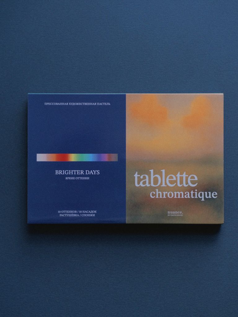 Серия наборов nuance. Tablette Chromatique — это мягкая спрессованная сухая пастель в формате палеток. Подходит для нанесения специальными мягкими аппликаторами-спонжами. В каждом наборе 10 оттенков, мастихин для пастели со сменными аппликаторами (10 шт), а также три фигурных спонжа для покрытия больших поверхностей, растушёвки и точечного нанесения ребром: овальный, прямоугольный и остроугольный. Благодаря высокой концентрации пигмента, пастель мягко ложится на поверхность, позволяя создавать плавные градиенты. Отлично смешивается и растушевывается. Применяется как в классической пастельной технике, так и для работы с холодным фарфором, фоамираном, тканью и полимерной глиной. Для чего она подойдёт: Для живописи — можно работать слоями, создавать плавные переходы и тонкие градиенты, добиваться акварельной мягкости, но при этом оставаться в сухой технике. Подмалёвков — прессованную пастель часто используют как базу: быстро перекрывают большие площади фона, потом сверху уточняют детали карандашами, пастельными мелками или краской. Смешанных техник — удобно сочетать с акварелью, тушью, маркерами, цветными карандашами. Дизайна и скетчинга — благодаря контролируемому нанесению подходят для иллюстрации, скетчей, фэшн-рисунка. Хобби и декоративных техник — такую пастель активно используют мастера по полимерной глине, керамике: мягкий пигмент ложится на поверхность и фиксируется лаком. На выбор три палитры: — Яркая Brighter days — Монохромная Grey gardens — Приглушенная, пастельная Be gentle