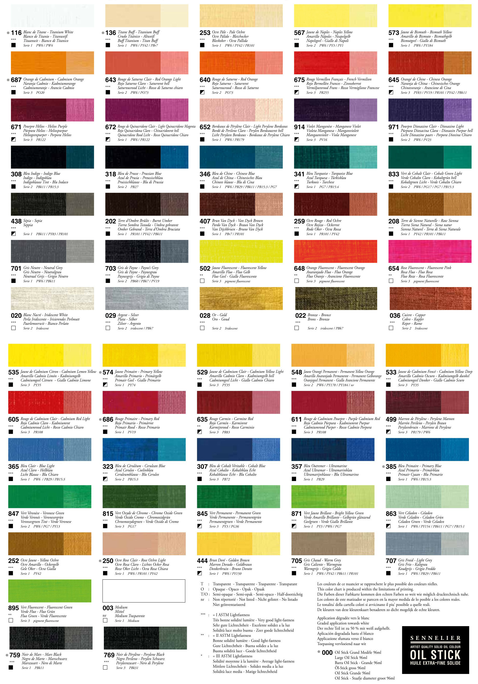 Масляная краска в форме пастели Sennelier "Oil Stick" представляет собой масляную краску в твердой форме. Часть масла заменена нейтральным минеральным воском, что позволяет придать краске форму "палочки". Краски отличаются высоким качеством и содержат высокую концентрацию пигментов, благодаря чему краска устойчива к выгоранию на дневном свету и минимально желтеет со временем. Краску можно наносить неп ично маслу из тюбиков, а при необходимости разбавлять обычным маслом. Перед использованием палочек Sennelier удалите поверхностную пленку. Эта пленка восстановится сама спустя несколько дней неиспользования. Нанесенная краска высыхает в течение 2-5 дней в зависимости от толщины слоев, температуры помещения и влажности воздуха. Палочки могут храниться неограниченно долго без особых условий хранения, однако следует избегать чрезмерного нагрева, поскольку это может повредить продукт. После полного высыхания картины поверхность можно покрыть лаком для масла. Время сушки составляет минимум 6 месяцев. Диаметр: 1.9 см Длина: 12.7 см