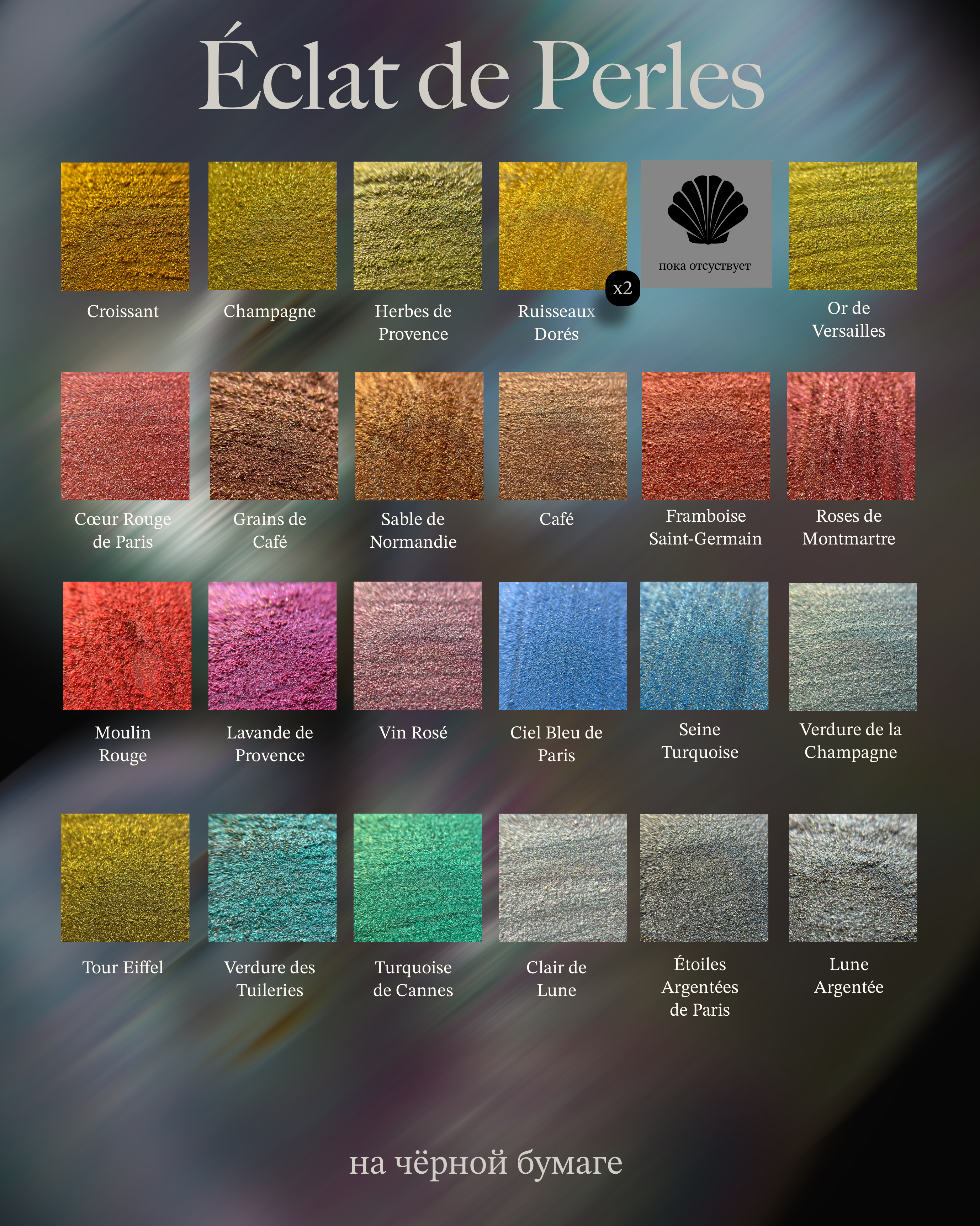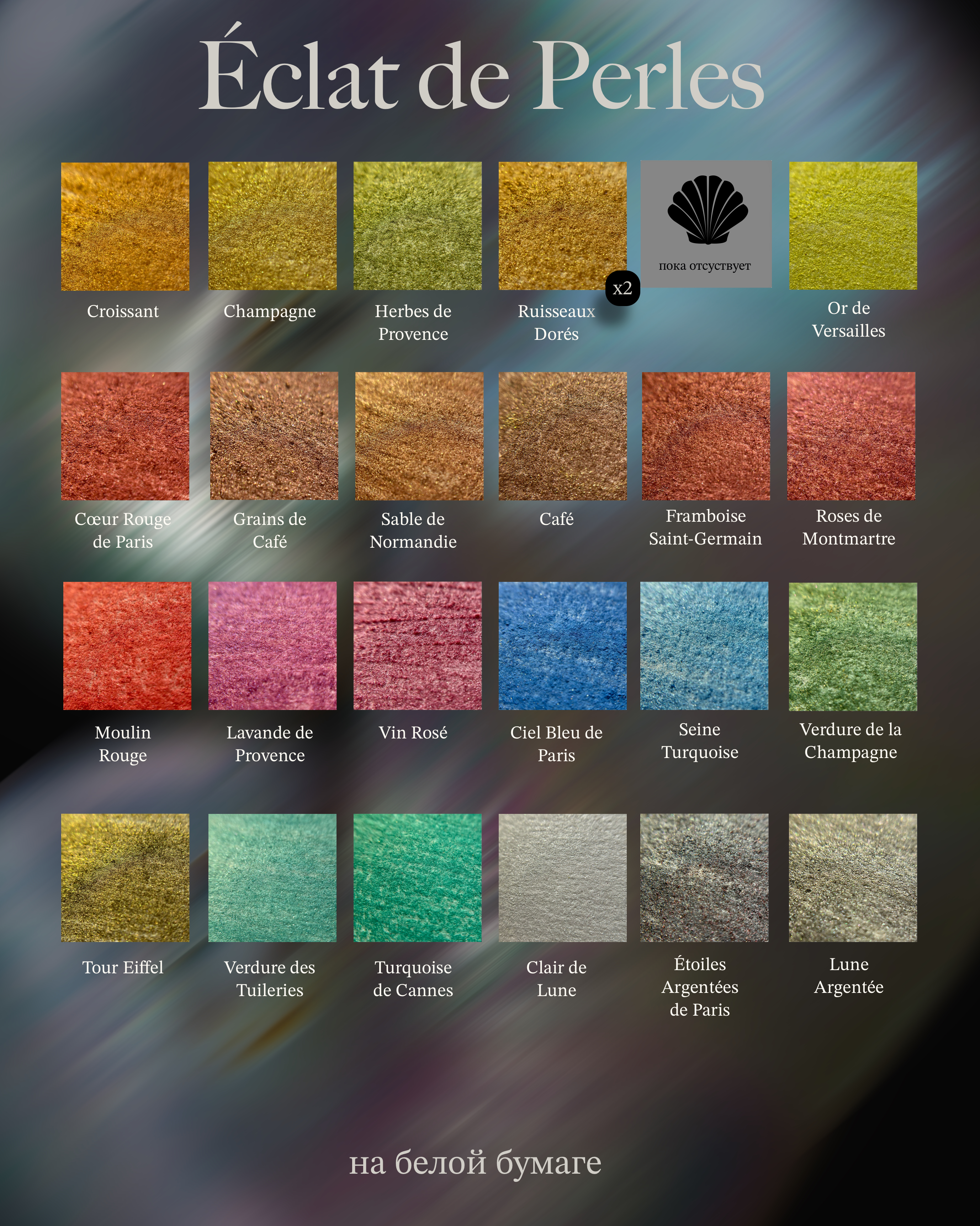 Взгляните на цвет по-новому. В этом наборе мы собрали жемчужные оттенки мягкой сухой пастели nuance., вдохновленные французской культурой. Добавьте сияющие акценты в ваши работы, экспериментируйте, смешивайте и открывайте совершенно новые горизонты в творчестве. Пусть всё блестит как Эйфелева башня в ночном Париже! В комплекте обновлённый кейс для пастели nuance. — он стал ещё прочнее и удобнее. Цвета в наборе: Круассан / Croissant Шампанское / Champagne Травы Прованса / Herbes de Provence Золотые ручьи / Ruisseaux Dor?s (х2) Золото Версаля / Or de Versailles Сердце Парижа / C?ur Rouge de Paris Кофейные зерна / Grains de Caf? Песок Нормандии / Sable de Normandie Кофе / Caf? Малина Сен-Жермен / Framboise Saint-Germain Розы Монмартра / Roses de Montmartre Мулен Руж / Moulin Rouge Прованская лаванда / Lavande de Provence Розе / Vin Ros? Небо Парижа / Ciel Bleu de Paris Бирюза Сены / Seine Turquoise Зелень Шампани / Verdure de la Champagne Эйфелева башня / Tour Eiffel Зеленые Тюильри / Verdure des Tuileries Бирюза Канн / Turquoise de Cannes Лунный свет / Clair de Lune Серебряные звезды Парижа / ?toiles Argent?es de Paris Серебряная луна / Lune Argent?e В этой версии набора пока отсутствует дополнительный золотистый оттенок, состав набора был изменен — добавлен дубль мелка Ruisseaux Dor?s.