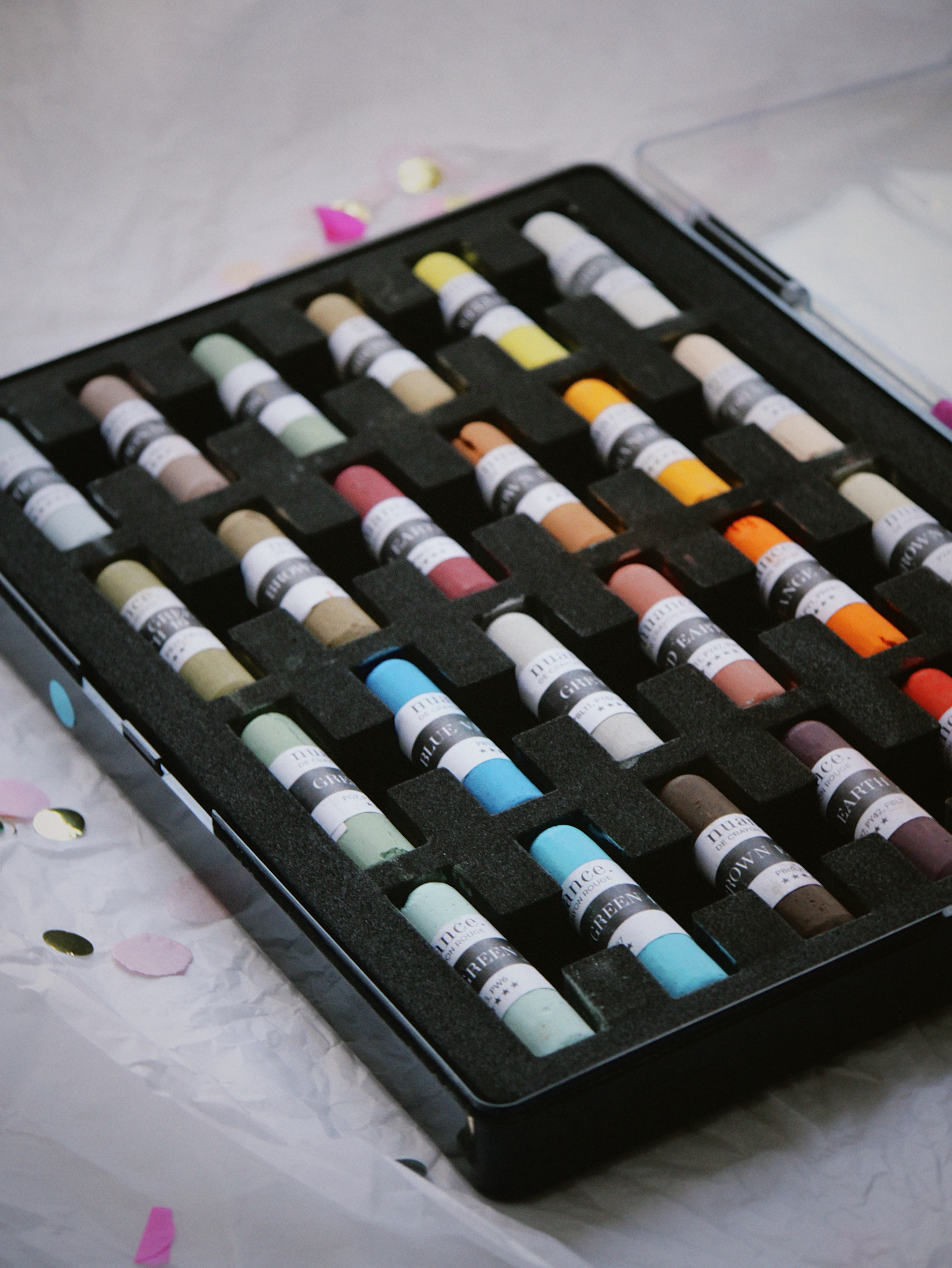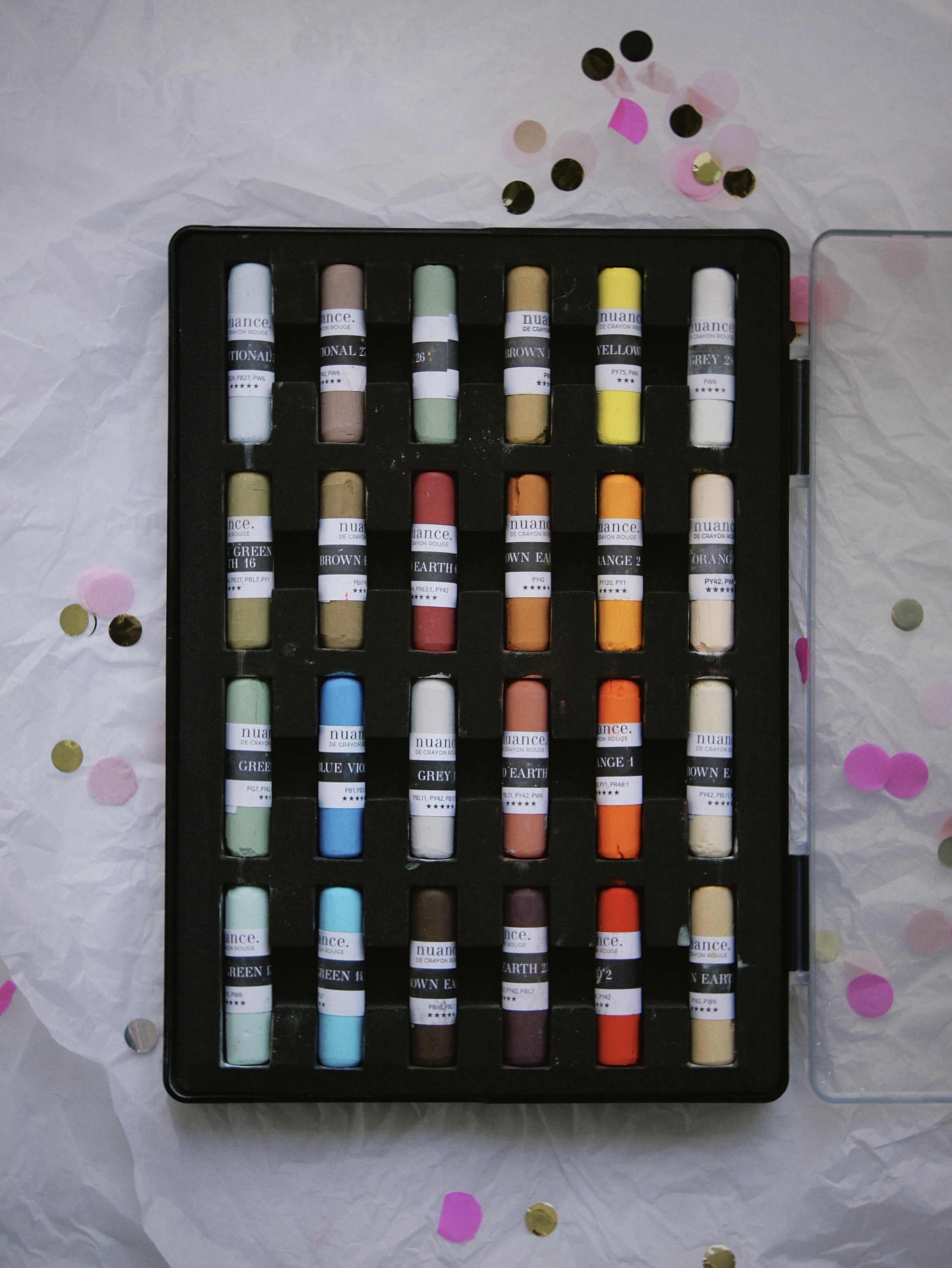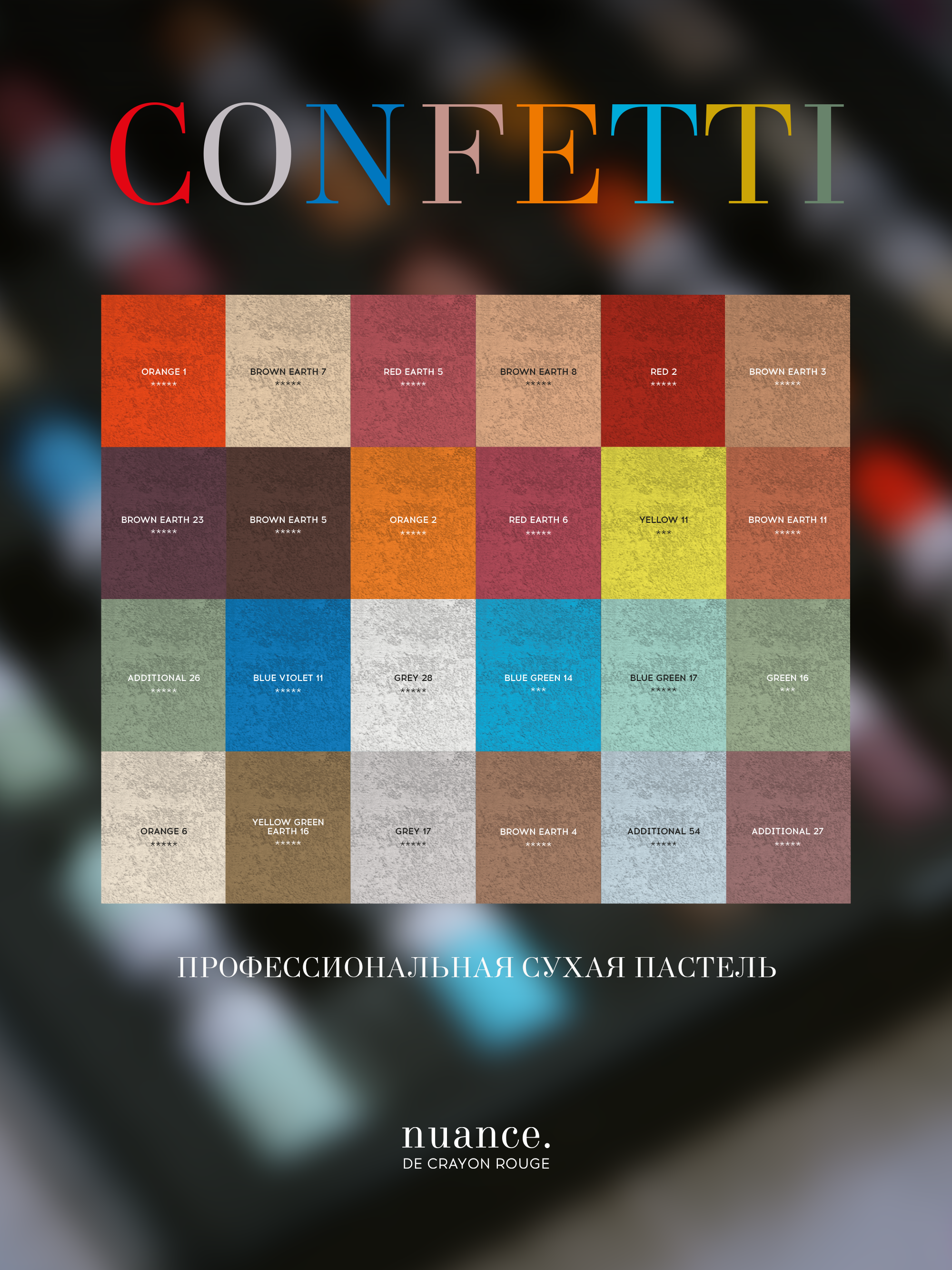 Профессиональная сухая пастель nuance. изготовлена из пигментов премиум-класса с высоким уровнем светостойкости. Мягко разносится по поверхности, позволяет создавать плавные градиенты и переходы цвета. Хорошо наслаивается и смешивается как между собой, так и с жемчужными оттенками коллекции. Подходит для профессиональных и студийных работ. Рекомендуем использовать на специализированной пастельной бумаге или на абразивной бумаге для пастели nuance. Сбалансированная палитра набора состоит из ярких, драматичных оттенков и дополнительных — деликатных и сдержанных. В комплекте 24 мелка и обновлённый кейс для пастели nuance. — он стал ещё прочнее и удобнее. Каждый мелок помещён в отдельный ложемент и защищён от повреждений и соприкосновения с соседними мелками. Цвета в наборе: • Orange 1 • Brown Earth 7 • Red Earth 5 • Brown Earth 8 • Red 2 • Brown Earth 3 • Brown Earth 23 • Brown Earth 5 • Orange 2 • Red Earth 6 • Yellow 11 • Brown Earth 11 • Additional 26 • Blue Violet 11 • Grey 28 • Blue Green 14 • Blue Green 17 • Green 16 • Orange 6 • Yellow Green Earth 16 • Grey 17 • Brown Earth 4 • Additional 54 • Additional 27