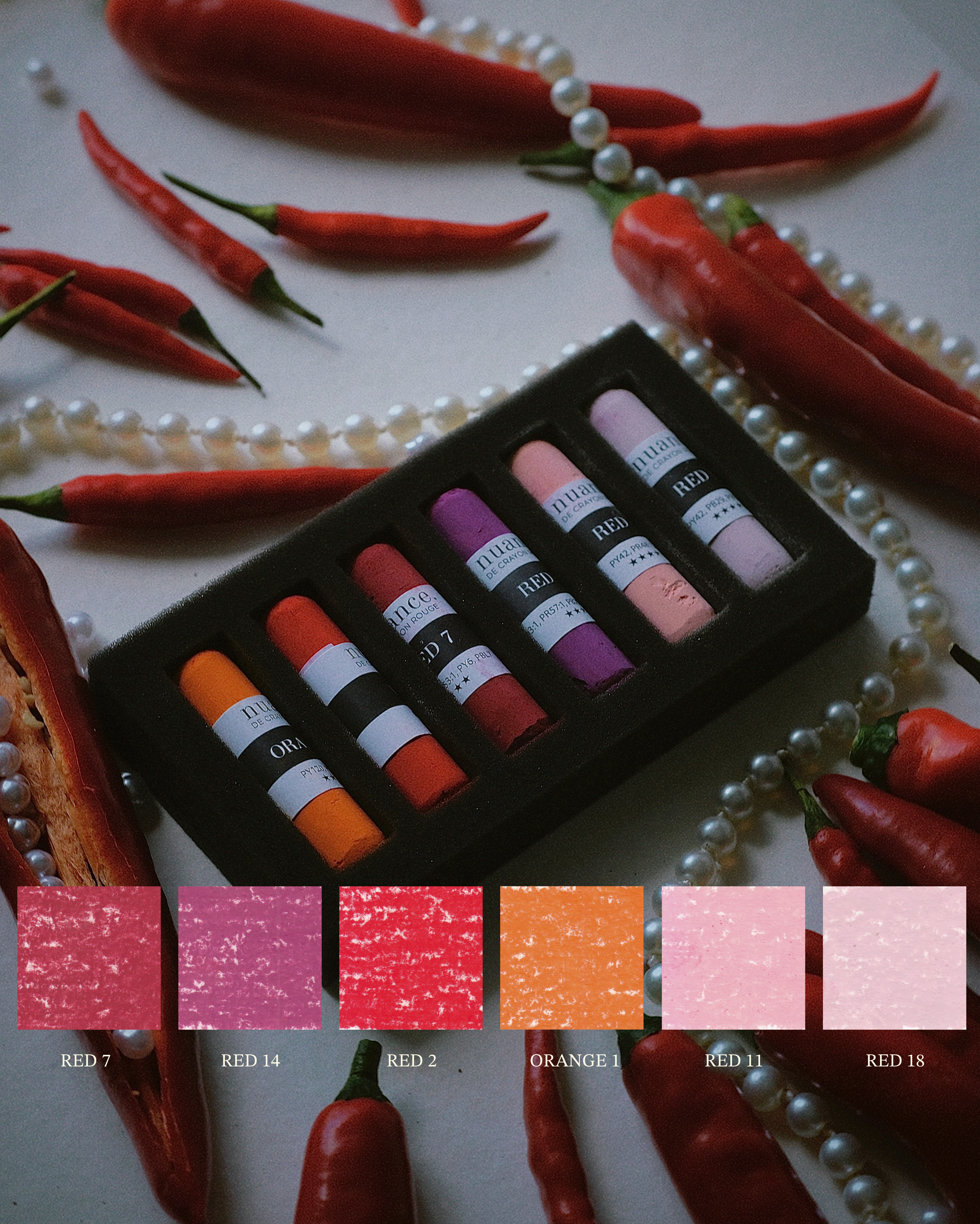 Профессиональная сухая пастель nuance. изготовлена из пигментов премиум-класса с высоким уровнем светостойкости. Мягко разносится по поверхности, позволяет создавать плавные градиенты цвета. Подходит для профессиональных и студийных работ. Рекомендуем использовать на специализированной пастельной бумаге или на пастельной абразивной бумаге nuance. В коллекцию наборов пастели nuance. вошли оттенки из существующей палитры, собранные по цветовым группам. Мелки внутри набора находятся на ложементе из поролона для удобной транспортировки. Оттенки мелков в наборе: Orange 1 ***** Red 2 ***** Red 7 *** Red 14 *** Red 11 *** Red 18 *****
