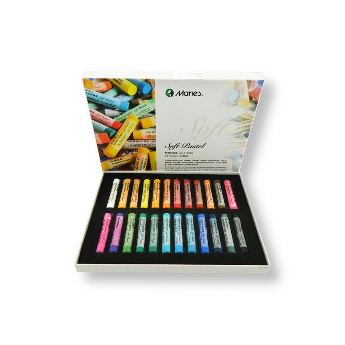Сухая пастель Maries произведена из высококачественных пигментов и связующего вещества, благодаря чему обладает яркими насыщенными цветами. Пастель обладает мягкой бархатистой фактурой, хорошо ложится на бумагу и отлично смешивается между собой. Данная серия пастели производится в мелках круглой формы, размером 65х10 мм. В качестве основы для пастели рекомендуется использовать фактурные поверхности или специальную бумагу для пастели. Чтобы готовая работа не осыпалась со временем, её рекомендуется закрепить специальным фиксативом для пастели. В наборе 24 мелка.