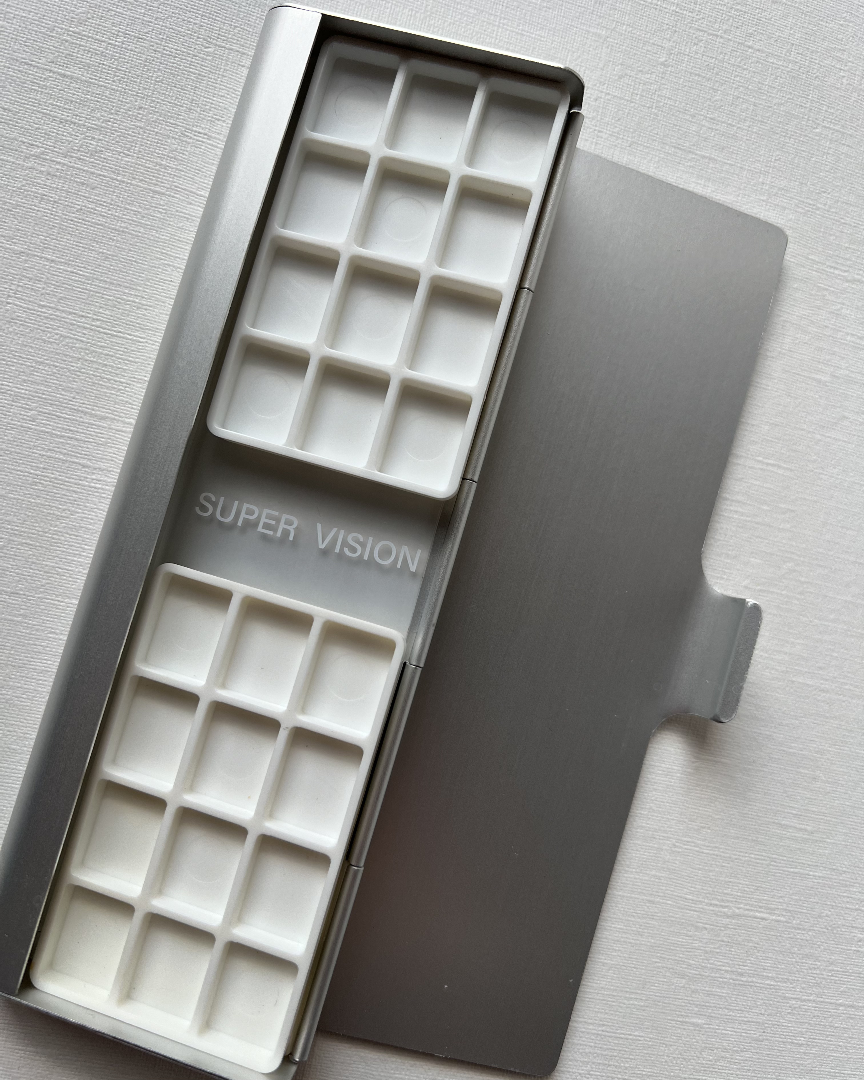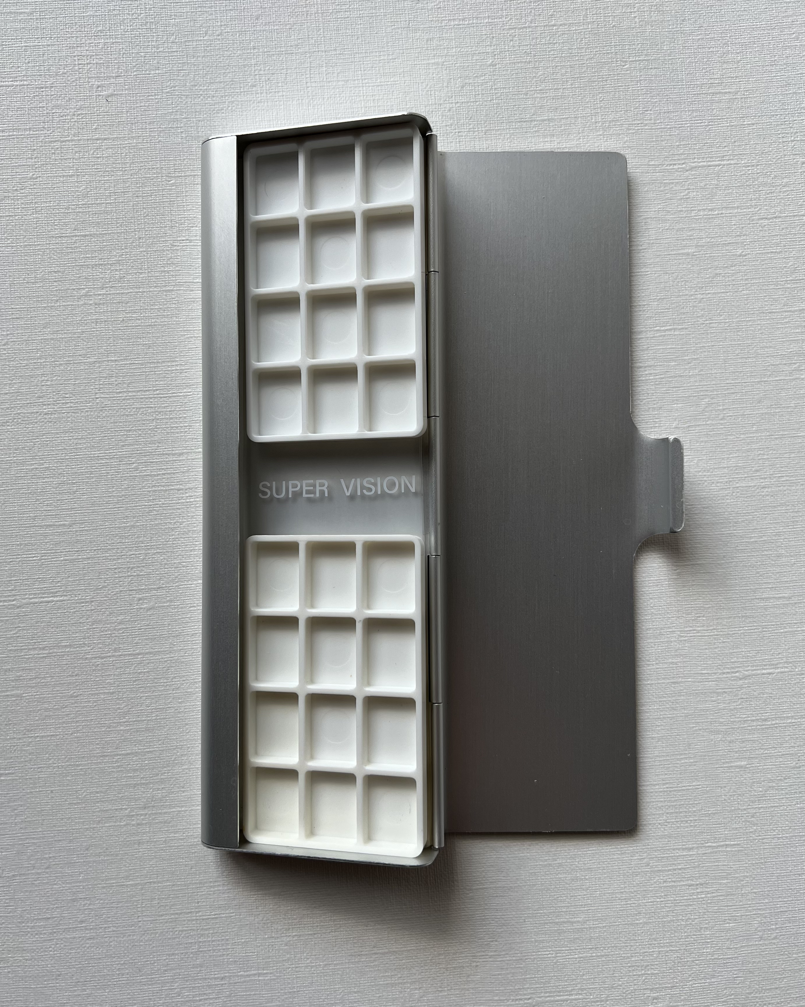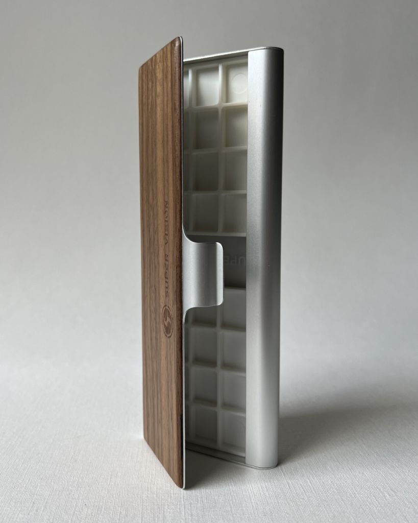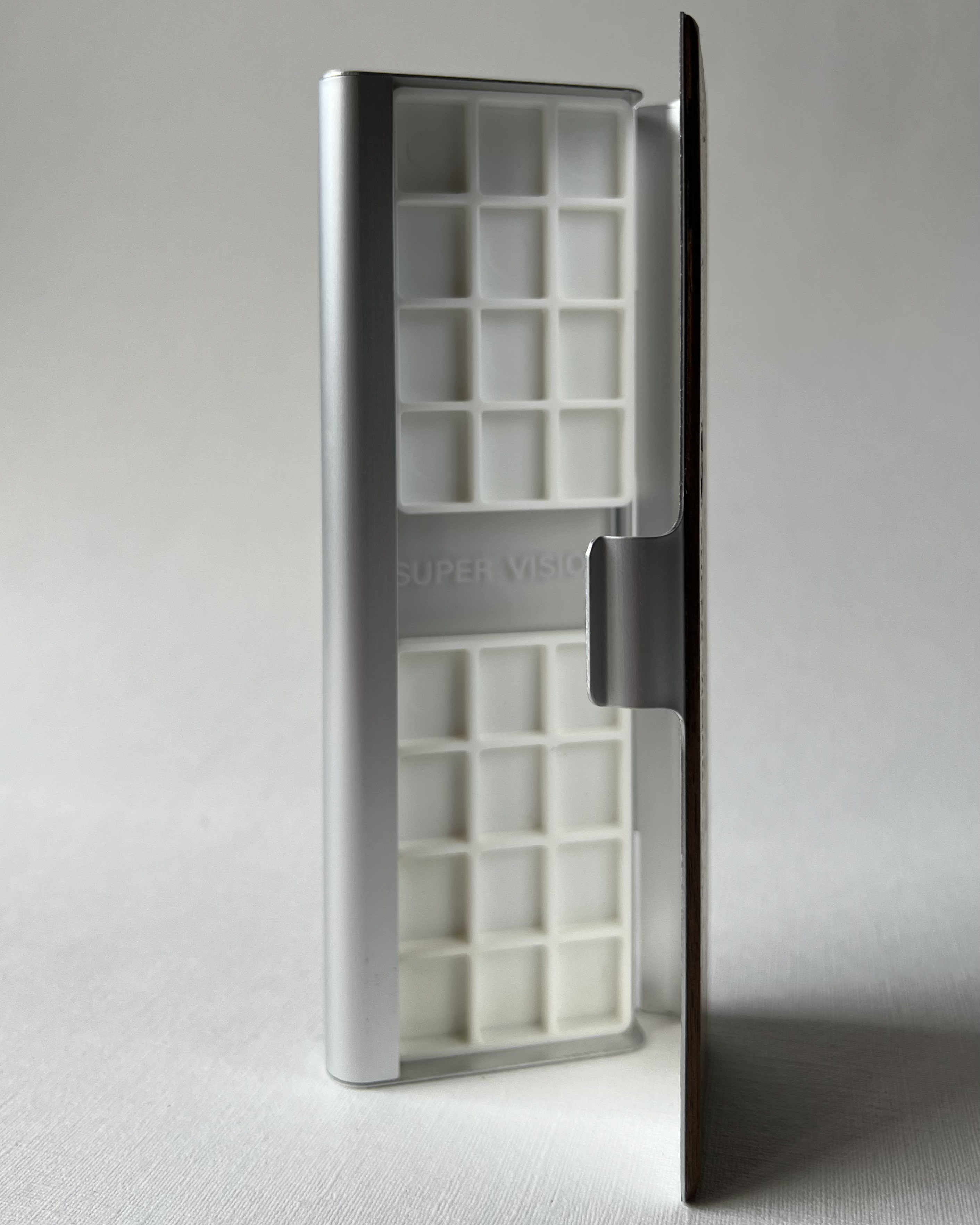 Стильный металлический пенал с 24 ячейками поможет создать ваш собственный идеальный набор красок, просто заполните ячейки любимыми цветами акварели и дайте им высохнуть. После того как краски закончатся промойте пластиковую подложку и наполните ячейки снова. Пенал оснащён крышкой с отделкой под дерево и надёжной защёлкой. Идеальный спутник для пленэров и путешествий.