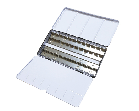 Металлические пеналы для акварельных красок предназначены для хранения и переноски кювет с акварельной краской. Идеально подходят для пленэров и путешествий. Пеналы изготовлены из металла, благодаря чему отличаются прочностью и долговечностью. Пеналы подходят для создания индивидуальной палитры цветов и хранения кювет с любимыми цветами. На обороте пенала расположено специальное кольцо под палец для надежной фиксации в руке художника во время работы. Пенал оснащен раскладной палитрой для смешивания красок. Внутри пенал белого цвета для чистого смешения оттенков. Пенал универсален, вмещает 48 полукювет или 24 стандартных полноразмерных кюветы.