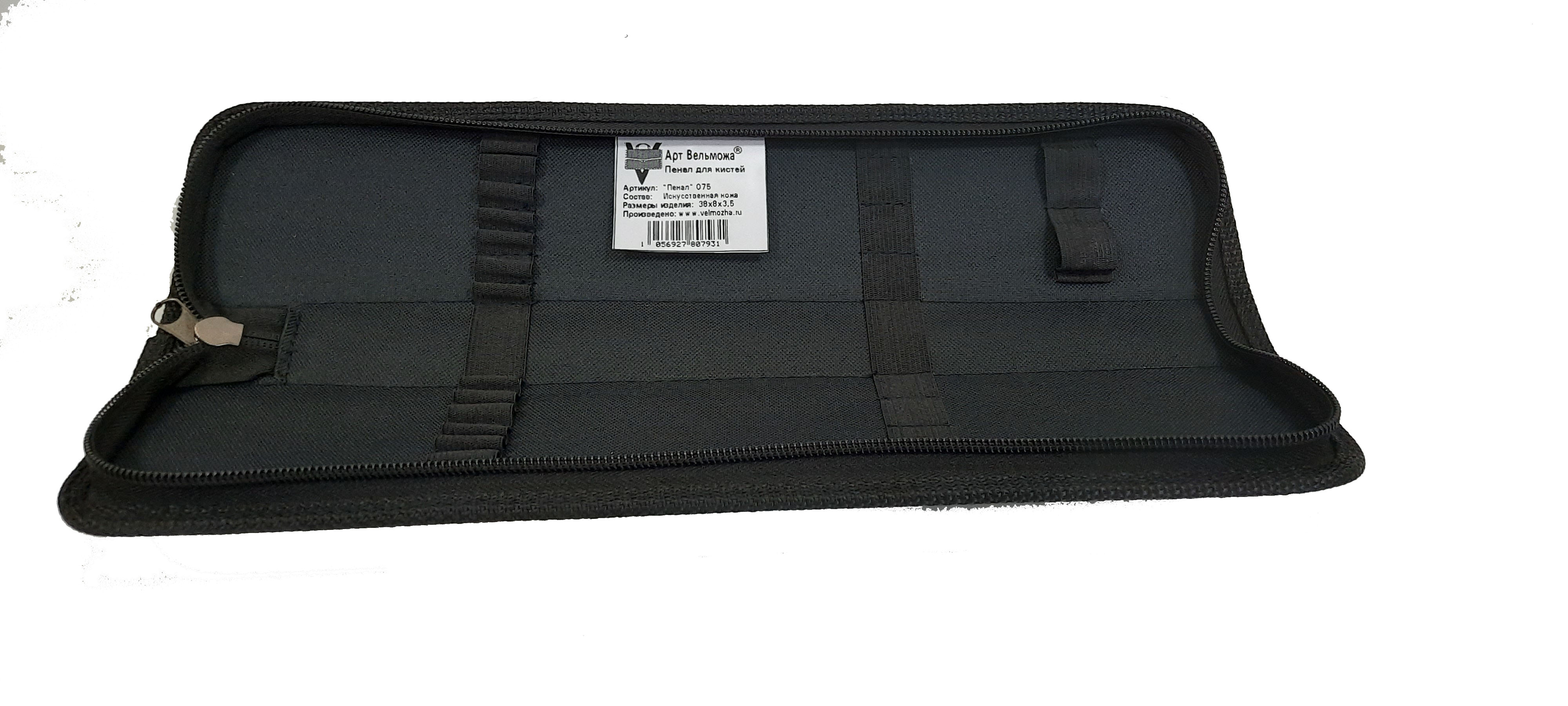 Размер изделия 38*8*3,5 см., жесткая основа, закрывается на "молнию". На внутренней, легко моющейся части пенала, расположены держатели (резинка) для фиксирования принадлежностей и материалов для рисования. Внешняя отделка кожзам.