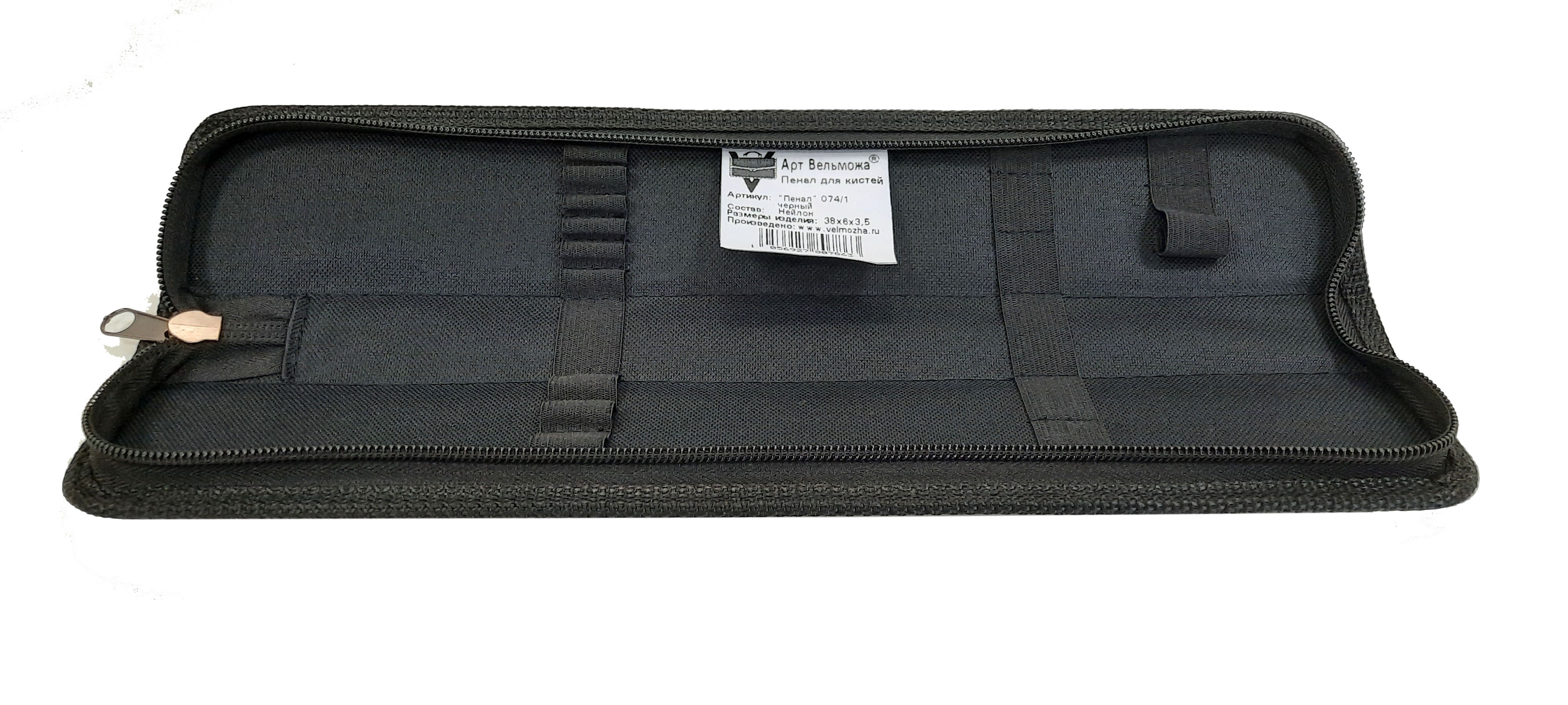 Размер изделия 38*6*3,5 см., жесткая основа, закрывается на "молнию". На внутренней, легко моющейся части пенала, расположены держатели (резинка) для фиксирования принадлежностей и материалов для рисования. Внешняя отделка кожзам.