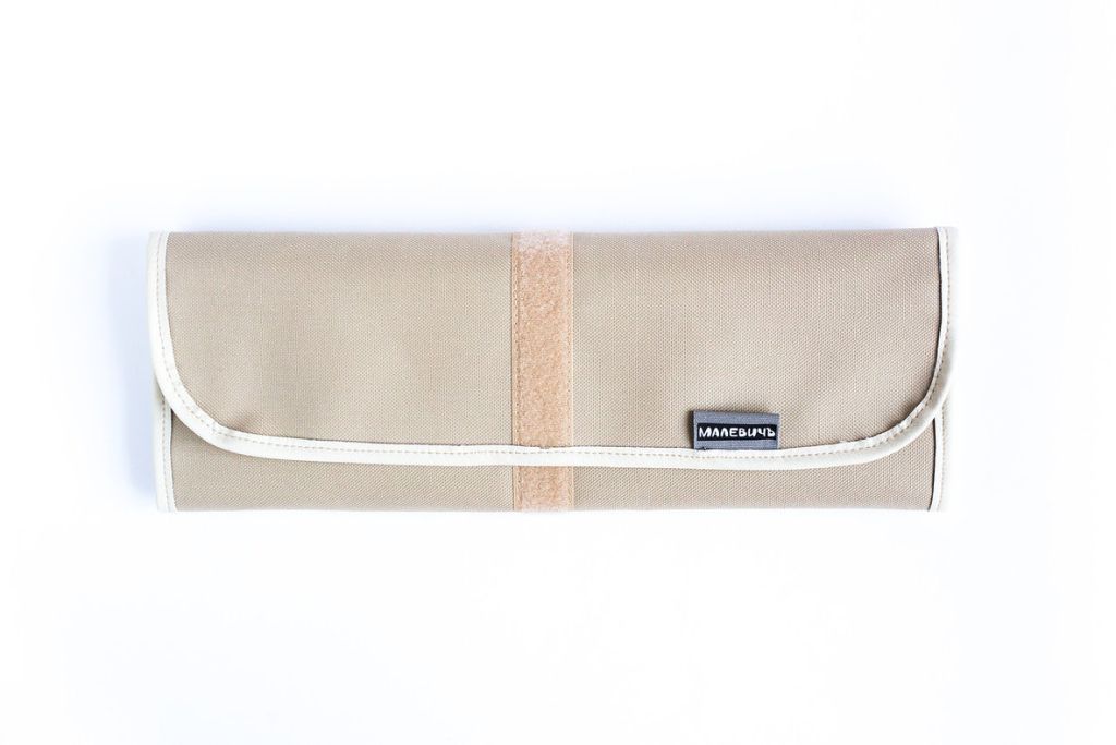 Скрутка выполнена из полиэстера в трех различных цветах. Внутри вшита эластичная резинка удерживающая кисти на своем месте. Предусмотрены ячейки для мастихинов. Специальная вставка из экокожи предохраняет ворс кисти от деформации. Материал износостойкий и не боится воды. Конструкция позволяет зафиксировать скрутку при любой толщине в зависимости от кол-ва кистей внутри. Пенал предназначен для кистей на ручке любой длины.