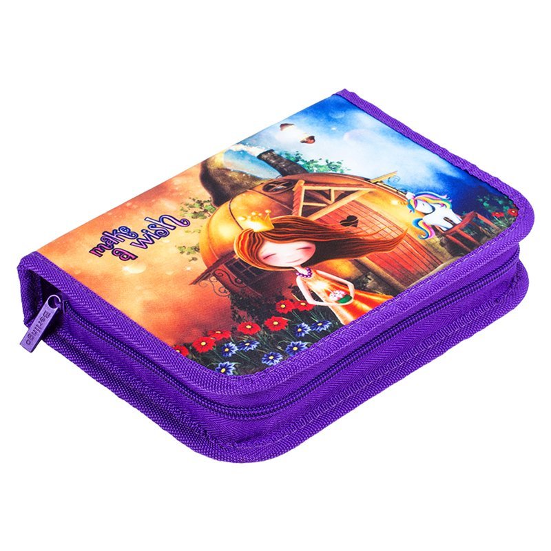 Удобный пенал для школьных канцелярских принадлежностей с одним отделением и надёжной застёжкой-молнией. Поставляются с наполнением 16 предметов: цветные карандаши - 6шт, чернографитный карандаш-1шт, фломастеры - 6цв, линейка 15 см, ластик, точилка. Материал - 100% полиэстер.