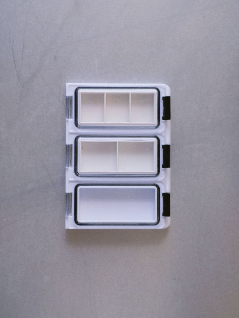 Универсальный герметичный кейс-палитра на 3 отделения. Каждой отделение проложено силиконовым уплотнителей и закрывается отдельной крышкой, надежно фиксирующейся на защелке. В комплекте 2 извлекаемых кюветы: — на 2 отделения 7,5 мл — на 3 отделения 5 мл Если вынуть вставки-кюветы, можно залить до 17 мл краски.