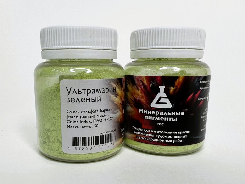 Ультрамарин зелёный — смесевой пигмент на основе баритовых белил и изумрудной ФЦ. •Светостойкость – 8 • Устойчивость к щелочам: 5 •Устойчивость извести: 5 •Устойчивость к кислоте: 5 •ColorIndex PB21+PG7 •Пригодность Акрил, Масло, Темпера, Акварель/Гуашь, Бетон, Штукатурка. •Цвет зелёный •Форма порошок •Укрывистость высокая. Пигменты предназначены для самостоятельного изготовления художественных красок. Их можно использовать с разнообразными связующими и при работе в различных техниках живописи. Натуральные пигменты незаменимы в реставрационных работах произведений древних мастеров, не знавших достижений современной химии.