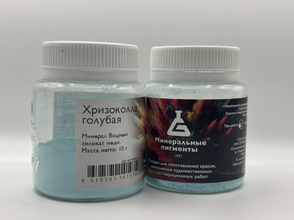 Хризоколла, бергрюн, златоклей, зеленая лазурь, минеральная зеленая, берг-грин. В природе встречается минерал хризоколла голубого или зеленовато-голубого цвета. По составу наиболее близко - Cu???Al?(H???Si?O?)(OH)? · nH?O. Известна с древности под именем хризоколла (от греческого ходла - клей или «золотой клей», в древности применялась для паяния золотых изделий). Древние различали по месту изготовления армянскую, македонскую и кипреную хризоколлу. Вероятно, именно хризоколлу описывает Теофраст, упоминая о том, что она ветречается в медных шахтах. В Западной Европе добывалась еще в 1 веке н.з. Римские художники употребляли ее в VI — VIII вв. Итальянцы в XIV. Характеристики: •Химическое описание: Минерал класса силикатов, водный силикат меди. •Химическая формула: Cu???Al?(H???Si?O?)(OH)? · nH?O. •Светостойкость – 8 •Устойчивость к щелочам:5 •Устойчивость извести:5 •Устойчивость к кислоте:2 •ColorIndex нет данных •Пригодность Акрил, Темпера, Акварель / Гуашь • Лессировочный •Цвет голубой-прозрачный •Форма порошок •Укрывистость средняя.
