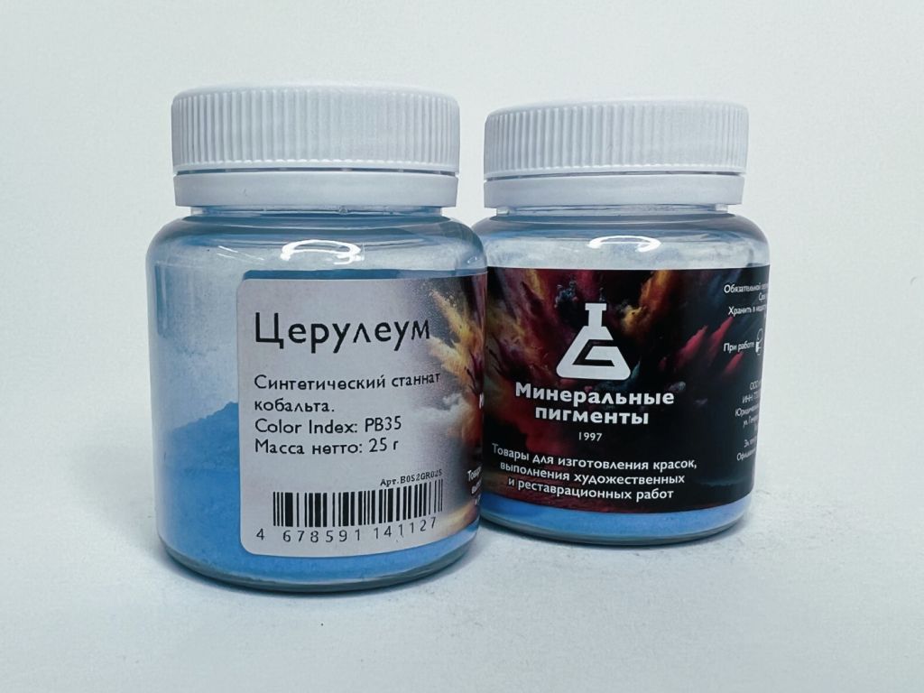 Кобальт небесно-голубой, целин. По составу — ортостаннат кобальта, в который (для улучшения цвета) входят оксиды магния и алюминия: 2CoOxSn02 и AI2O3 + MgO. Впервые получен в 1805 году, промышленное производство началось с 1860 года. Название церулеум — именно с 1860 года (не имеет никакого отношения к «церулеумому», упоминаемому Плинием. Имелись в виду, скорее всего, медьсодержащие минералы с медных рудников или осажденный органический лак. Устойчив к щелочам, свету, атмосфере, температуре (до 1250°С), при нагревании растворяется в кислотах. Название «церулеум» от латинского слова «carlum» — небо. Благодаря диоксиду олова обладает хорошей кроющей способностью. Цвет насыщенно-голубой. Церулеум отличается от других кобальтовых красок способностью сохранять свой истинный цвет при искусственном освещении, он не приобретает фиолетового оттенка, к чему вообще склонны кобальтовые краски. Пигмент пригоден для всех родов живописи. Применялся на масле и в акварели, сейчас используется в производстве художественных красок, а также для окраски стекла и фарфора. Церулеум, как и все кобальтовые краски, не рекомендуется смешивать с ультрамарином, краплаками, золотисто-желтой, Ван-Диком. Кобальт-оловянный Co2SnO4 — это неорганический пигмент, который является продуктом реакции прокаливания смеси различных количеств оксида кобальта (II) и оксида олова (III). •Химическое описание: Станнат кобальта. •Химическая формула: Co2SnO4 •Светостойкость – 8 •Устойчивость к щелочам:5 •Устойчивость извести:5 •Устойчивость к кислоте:5 •ColorIndex PB35 •Лессировочный •Пригодность Акрил, Темпера, Акварель / Гуашь, силикатное связующие, масло, бетон •Цвет – Квинтэссенция небесно-голубого •Укрывистость средняя. Пигменты предназначены для самостоятельного изготовления художественных красок. Их можно использовать с разнообразными связующими и при работе в различных техниках живописи. Натуральные пигменты незаменимы в реставрационных работах произведений древних мастеров, не знавших достижений современной химии.
