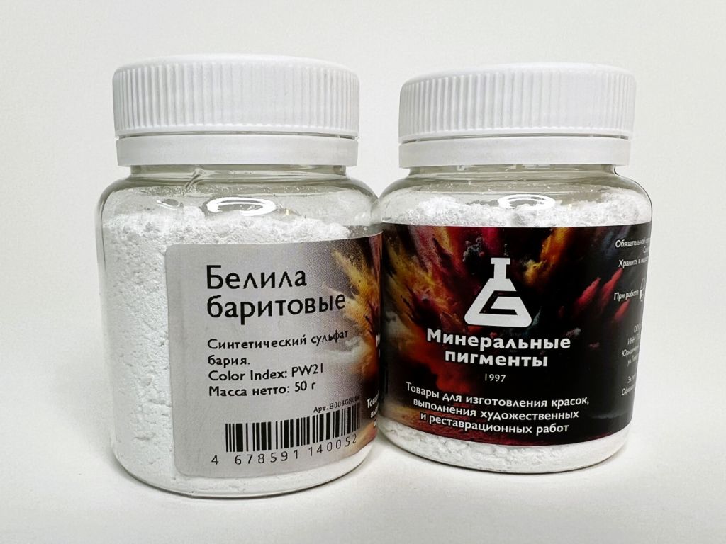 Бланфикс, тяжелый шпат, постоянные или перманентные белила, шифервейс. Химический состав - BaS04. Искусственно впервые был получен в Англии в 1830 году Кульманом. Белый тяжелый порошок. Существует как природный минерал - тяжелый шпат, так и искусственный пигмент - сульфат бария. Минерал, содержащий соединения бария, был открыт в 1602 г. болонским алхимиком Касциароло. Характеристики: •Химическое описание: Сульфат бария. Синтетический пигмент. Тонкодисперсный порошок белого цвета. Полупрозрачные. Увеличивают интенсивность цвета при смешивании с другими пигментами, особенно с органическими. •Химическая формула: BaSO4 •Светостойкость – 8 • Устойчивость к щелочам:5 •Устойчивость извести:5 •Устойчивость к кислоте:5 •ColorIndex PW 21 •Лессировочный •Пригодность Акрил, Фреска, Керамика, Масло, Темпера, Акварель / Гуашь, Силикатное связующее, Цемент / Штукатурка •Цвет Белый •Форма порошок •Укрывистость средняя. Пигменты предназначены для самостоятельного изготовления художественных красок. Их можно использовать с разнообразными связующими и при работе в различных техниках живописи.
