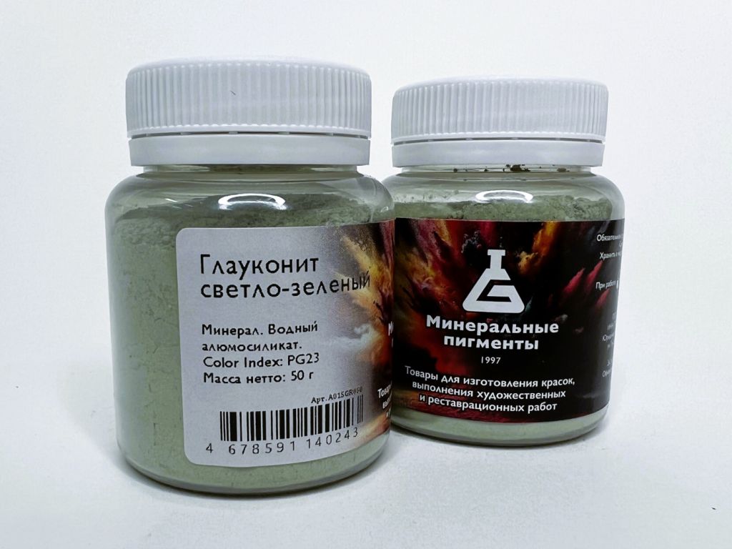 Зеленая земля и глауконит - природные глинистые минералы из группы железо- алюмосиликатов калия. Обычно содержит примесь кварца. Название от греческого глаукос - синевато-зеленый - terre-verte, зеленая земля, празелень - наиболее распространенный в природе минерал зеленого цвета, пригодный в качестве пигмента. Минерал впервые описан Керферштейном в 1828 г. Глауконит установлен в самых древних иконах. Именно к глауконитам относятся знаменитые веронские и богемские земли. •Минерал, водный алюмосиликат железа, кремнезема и oксидa калия непостоянного состава, относится к группе гидрослюд. •Химическое описание: Минерал •Химическая формула: (K,Na)(Fe3+,Al,Mg)?(Si,Al)?O??(OH)? •Светостойкость – 8 •Устойчивость к щелочам:5 •Устойчивость извести:5 •Устойчивость к кислоте:5 •ColorIndex PG23 •Лессировочный •Пригодность Акрил, Фреска, Керамика, Масло, Темпера, Акварель / Гуашь, Силикатное связующее, Цемент / Штукатурка •Цвет травяно-зелёный •Форма порошок •Укрывистость высокая. Пигменты предназначены для самостоятельного изготовления художественных красок. Их можно использовать с разнообразными связующими и при работе в различных техниках живописи. Натуральные пигменты незаменимы в реставрационных работах произведений древних мастеров, не знавших достижений современной химии.