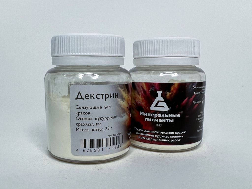 Декстрин принадлежит к группе углеводов-полисахаридов. Получается декстрин при нагревании крахмала до 180—200° С или до 110° С с разбавленной азотной или соляной кислотами. Желтый декстрин легко растворяется в воде и образует густые клейкие растворы. После высыхания пленка декстрина мутнеет, становится гигроскопичной, поэтому декстрин применяется только в качестве добавки к основному связующему веществу. Акварельные краски на декстрине ровнее ложатся на бумагу, чем такие же краски на гуммиарабике и на большинстве других камедей. Пигменты предназначены для самостоятельного изготовления художественных красок. Их можно использовать с разнообразными связующими и при работе в различных техниках живописи. Натуральные пигменты незаменимы в реставрационных работах произведений древних мастеров, не знавших достижений современной химии.
