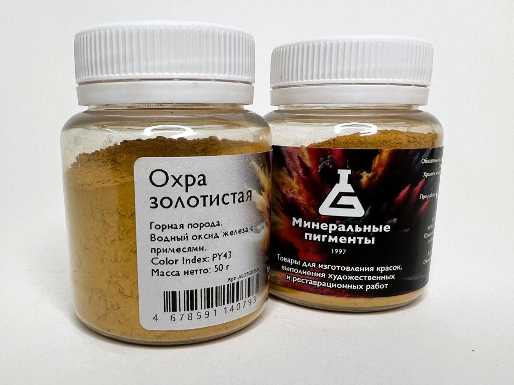 Золотисто-жёлтая охра имеет в своём составе гидратированный оксид железа – лимонит. В этом соединении железо свободно взаимодействует с водой. •Химическое описание: горная порода, представляющий собой глину, окрашенную оксидом железа. Содержание железа 16-18 % • Химическая формула: FeO(OH) •Светостойкость - 8 •ColorIndex PY 43 •Пригодность Акрил, Фреска, Керамика, Масло, Темпера, Акварель / Гуашь, Цемент / Штукатурка •Цвет золотисто-жёлтый •Лессировочный •Форма порошок •Устойчивость к щелочам:5 •Устойчивость извести:5 •Устойчивость к кислоте:5 • Укрывистость высокая. Пигменты предназначены для самостоятельного изготовления художественных красок. Их можно использовать с разнообразными связующими и при работе в различных техниках живописи. Натуральные пигменты незаменимы в реставрационных работах произведений древних мастеров, не знавших достижений современной химии.