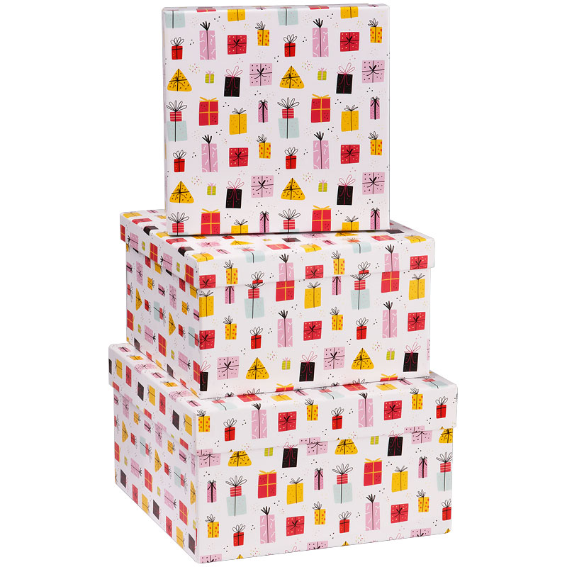 Подарочные коробки MESHU – лучшее решение, чтобы порадовать ваших близких и создать праздничное настроение. Набор состоит из трёх квадратных коробок размеров 19,5*19,5*11 см, 17,5*17,5*10 см, 15,5*15,5*9 см. Изделия выполнены из твёрдого картона, покрытого мелованной бумагой с дизайнерским рисунком. Подарок, преподнесенный в яркой и оригинальной упаковке, непременно станет самым запоминающимся.