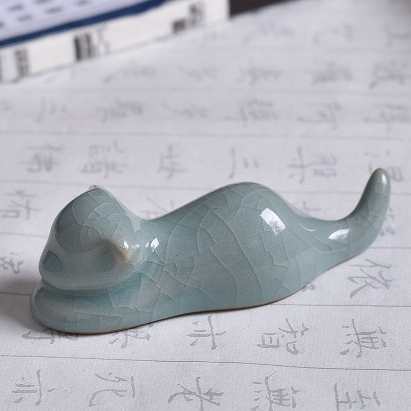 Фарфоровая подставка для кистей в аутентичном дизайне в форме котика станет не только полезным аксессуаром, но и настоящим украшением вашего рабочего стола и ярким пополнением вашей коллекции китайских инструментов для живописи и каллиграфии. Длина подставки 10.2 см, высота 3см. Покрыта эмалью с эффектом кракле.