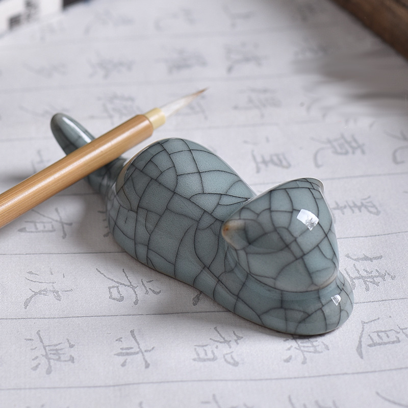 Фарфоровая подставка для кистей в аутентичном дизайне в форме котика станет не только полезным аксессуаром, но и настоящим украшением вашего рабочего стола и ярким пополнением вашей коллекции китайских инструментов для живописи и каллиграфии. Длина подставки 10.2 см, высота 3.3 см. Покрыта эмалью с эффектом кракле.