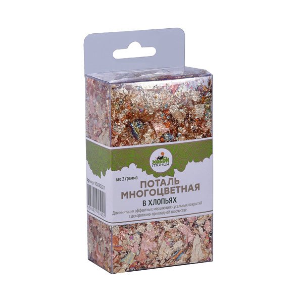 Поталь в хлопьях предназначена для имитации эффектных мерцающих сусальных покрытий в декоративно-прикладном творчестве. Способ применения: Очистить поверхность от грязи и ржавчины. Деревянные и металлические поверхности предварительно загрунтовать. Стеклянные и пластиковые обезжирить. Нанести специальный клей ровным слоем без пропусков и подтеков. Выждать время для приобретения клеем необходимой липкости. Насыпать поталь плотным слоем. Слегка прижать и разгладить. Дождаться полного высыхания клея и снять излишки ватным тампоном. Нанести защитный покрывной лак для потали.