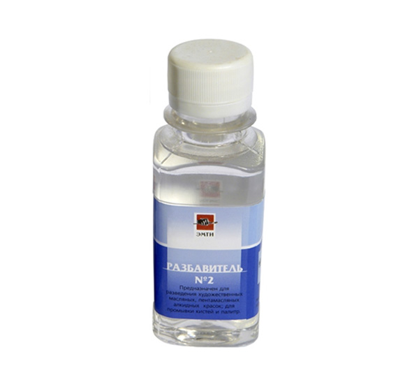 Разбавитель №2 ЭМТИ. Применяется для разведения художественных масляных, акриловых, алкидных красок, специальных средств для масляной или акриловой живописи, гелей, паст. Так же используется для очистки поверхности, кистей и палитр. Может служить разбавителем для масла и различных добавок. Состав: очищенный уайт-спирит. Объем: 100 мл.