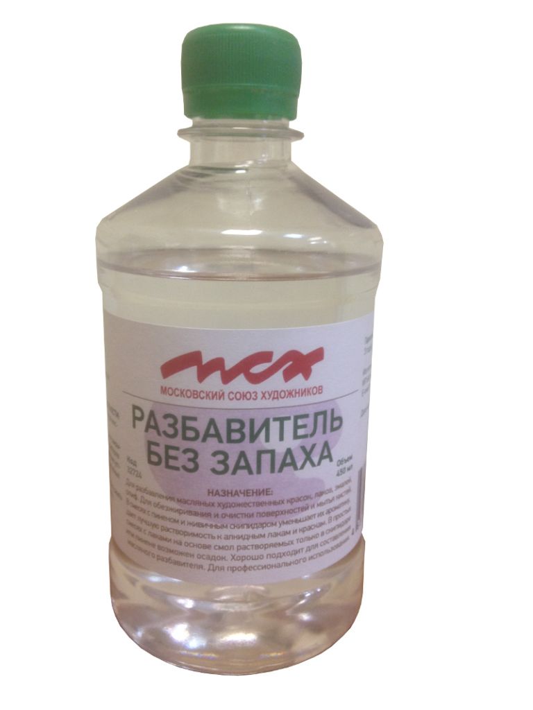 О товаре: разбавитель без запаха МСХ – это тщательно очищенн ичными пинену. Отсутствие неприятного запаха позволяет работать с разбавителем людям чувствительным к запахам. Удобен для работы в закрытом помещении. Выпускается в пластиковых бутылках объемом 450 миллилитров. Применение: для разведения художественных масляных красок, лаков и эмалей. Производство: разработан специалистами Московского Союза Художников и произведен в России.