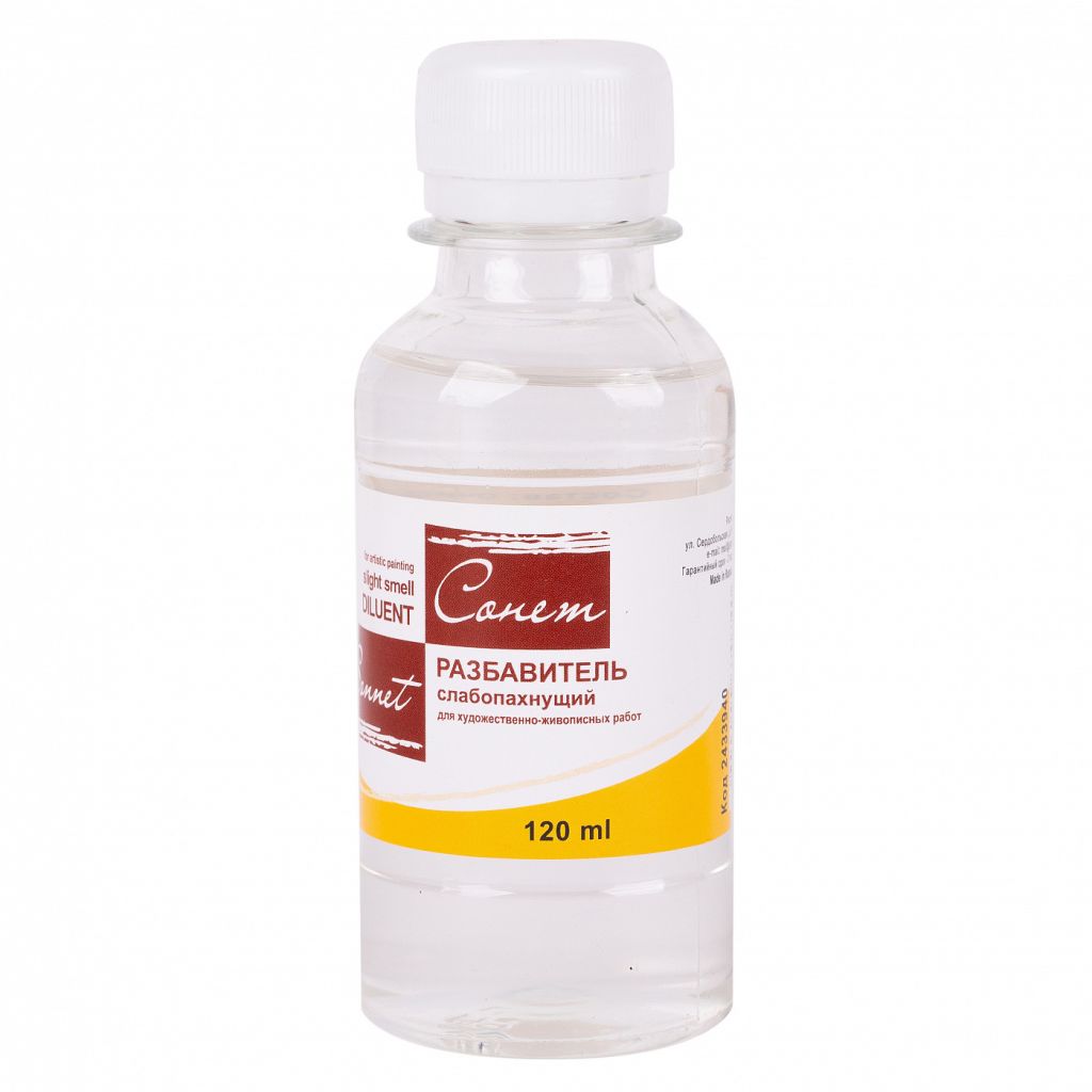 Разбавитель слабопахнущий Сонет. Используется для разведения художественных масляных красок в классической, многослойной техниках живописи. Состав: очищенный уайт-спирит. Объем: 120 мл.