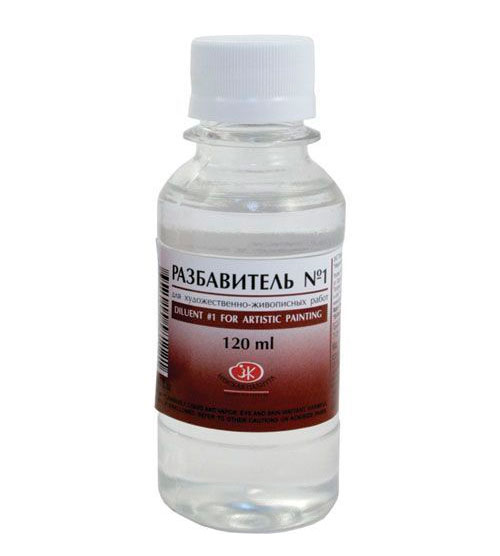 Разбавитель №1 "Невская палитра". Предназначен для разведения художественных масляных, пентамасляных, алкидных красок и для смывания красок с полотен, палитр и кистей. Для разбавления лаков не пригоден. Состав: уайт-спирит, скипидар. Объем: 120 мл.
