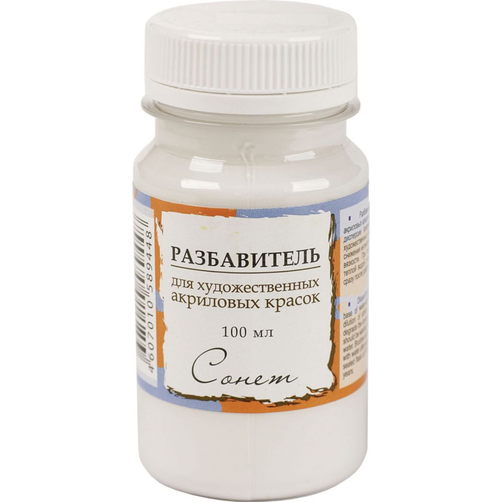 Разбавитель для акриловых красок "Сонет". Используется для разбавления художественных акриловых красок с целью снижения интенсивности цвета и уменьшения вязкости. Изготовлен на основе водной акриловой дисперсии. Объем: 100 мл.
