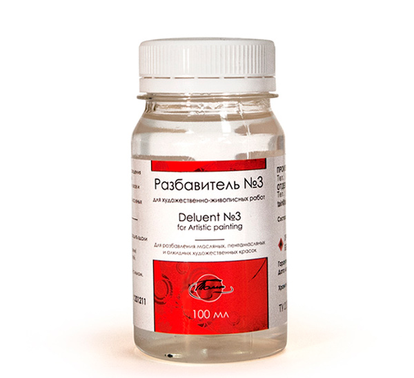 Разбавитель №3 Уайт-спирит Таир. Применяются для разведения художественных масляных, пентамасляных и алкидных красок, разбавления лаков и жирных масел. Может использоваться для очистки от масляных красок кистей и палитр. Объем: 100 мл.