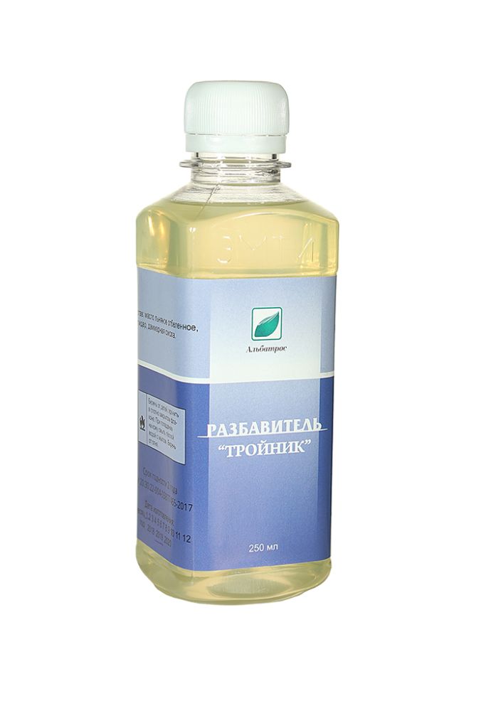 Разбавитель "Тройник" ЭМТИ. Состоит из смеси даммарного, льняного масла и скипидара. Применяется для разведения масляных красок с целью снижения концентрации, а также в качестве промежуточного слоя для усиления адгезии красочных слоев. Натуральный продукт. Объем: 250 мл.