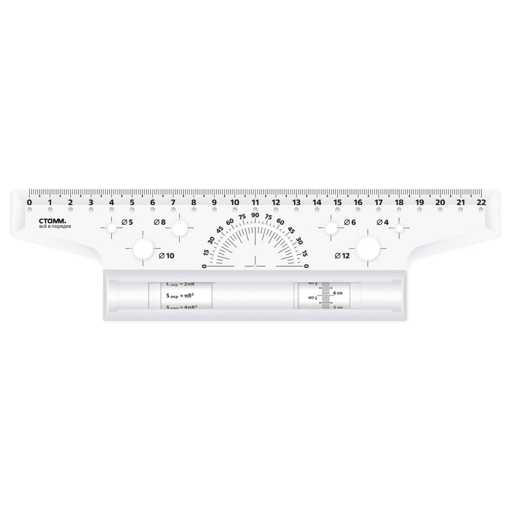 Рейсшина 22 см. «СТАММ» предназначена для выполнения чертёжных и измерительных работ. Линейка-рейсшина оборудована металлическим роликом, и идеально подходит для нанесения ровных параллельных линий. Длина шкалы – 22 см. Благодаря специальному покрытию ролика линейка не проскальзывает по бумаге. На изделии предусмотрен транспортир 180° и 6 трафаретов окружностей. Изготовлена из качественного полистирола.