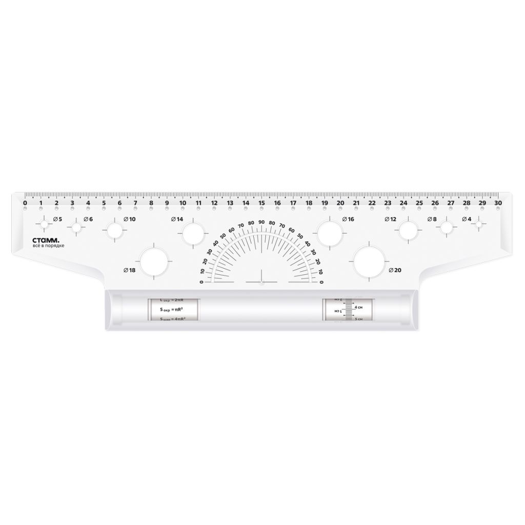 Рейсшина 30 см. «СТАММ» предназначена для выполнения чертёжных и измерительных работ. Линейка-рейсшина оборудована металлическим роликом, и идеально подходит для нанесения ровных параллельных линий. Длина шкалы – 30 см. Благодаря специальному покрытию ролика линейка не проскальзывает по бумаге. На изделии предусмотрен транспортир 180° и 10 трафаретов окружностей. Изготовлена из качественного полистирола.