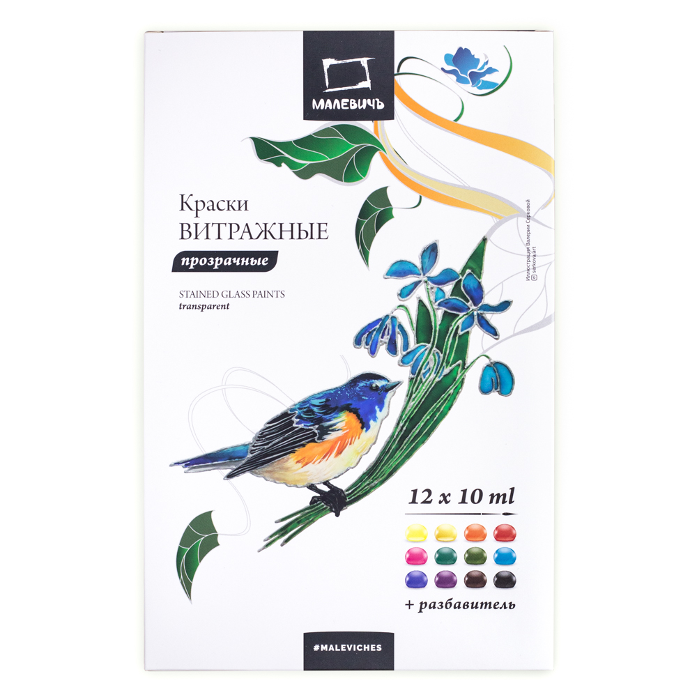 Витражная прозрачная акриловая краска "Малевич" на водной основе для росписи стекла, фарфора, предметов из светло керамики и зеркал. Краски светостойкие, отлично смешиваются, легко наносятся и быстро высыхают. В набор входит разбавитель-медиум, при помощи которого можно варьировать густоту краски, создавая элементы и декоративные изображения различной степени прозрачности. Особенности применения: перед нанесением краски тщательно обезжирьте поверхность основы. Для создания эффекта витража нанесите контуры деталей изображения либо специальным контуром по стеклу, либо нужным цветом при помощи тюбика, кисти или специального контура для росписи. Заполните краской секторы, обведенные контуром. Используйте разбавитель для того, чтобы сделать краску более прозрачной. Внимание! 100% высыхание рисунка происходит через 3-5 суток. После того как рисунок высох, изделие можно протирать или мыть с водой и моющим средством. Для большей сохранности поверхность рисунка можно покрыть акриловым лаком. Для работы с краской используйте кисти из синтетики средней степени мягкости. После применения кисти требуется тщательно промыть с водой и мылом, чтобы предотвратить засыхание.