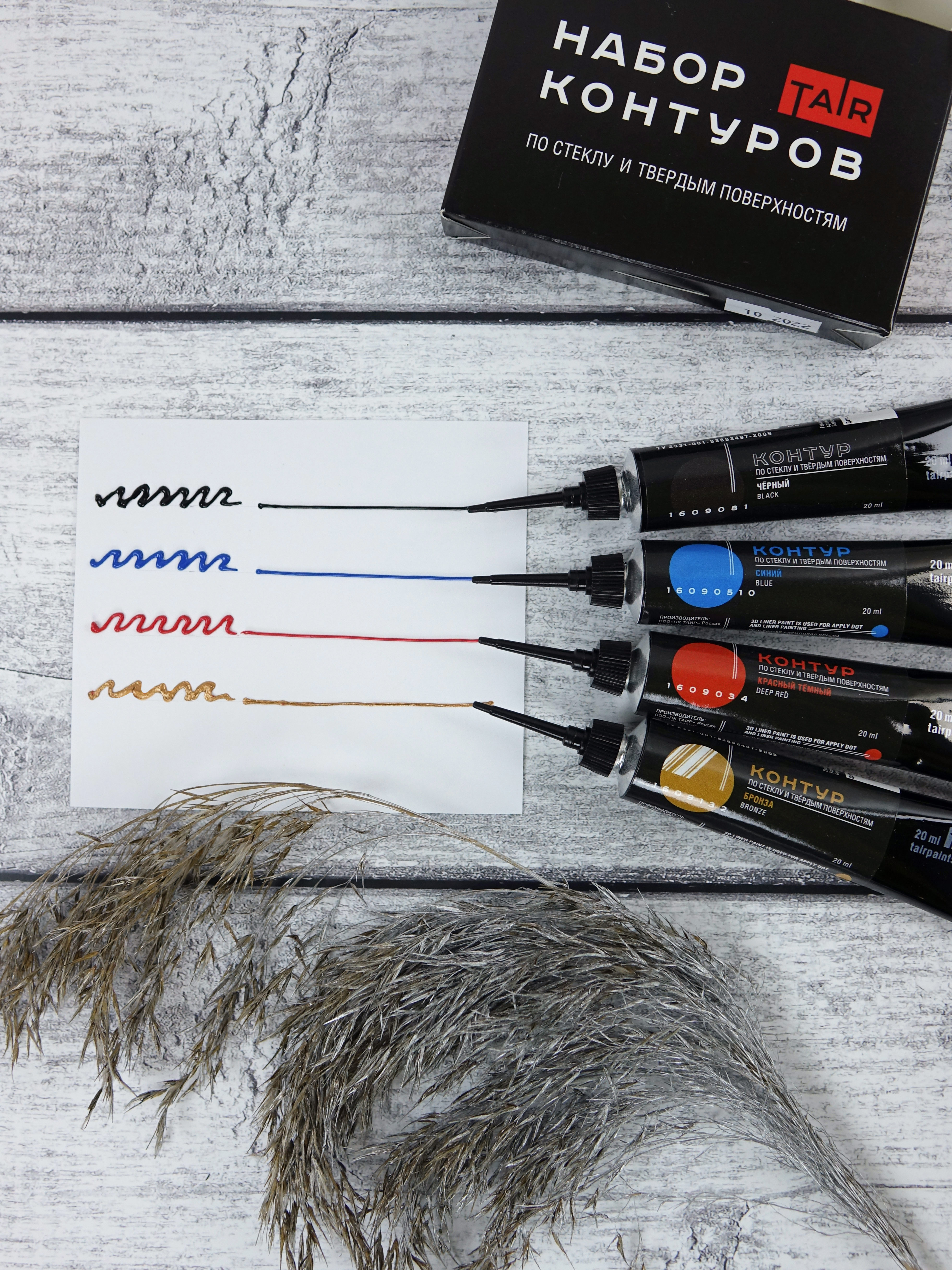 Контуры — это акриловые краски в тубе с острым наконечником, которые наносятся прямо из тюбика. Предназначены для создания контурных и точечных рисунков на стекле и других твердых поверхностях. Обладают высокой рельефностью и хорошо держат форму. Акриловые контуры для стекла и других твердых поверхностей обладают густой консистенцией. Они прекрасно ложатся на любые очищенные и обезжиренные основы: стекло, керамику, фарфор, глину, дерево, камень и другие. Контуры ТАИР отлично зарекомендовали себя в технике популярной точечной росписи и имитации вышивки. Кроме того, они используются для подрисовок тонких линий, узоров и рисования надписей в миксмедийных и скрапбукинговых техниках. В декупаже контуры часто применяются для того, чтобы скрыть границу приклеенного рисунка или для подрисовки отдельных элементов. Также контуры по стеклу используются при работе с витражными красками, для создания разграничительных барьеров между заливками разных цветов. Состав: акриловая дисперсия, пигменты, наполнитель, загуститель, консерванты, вода.