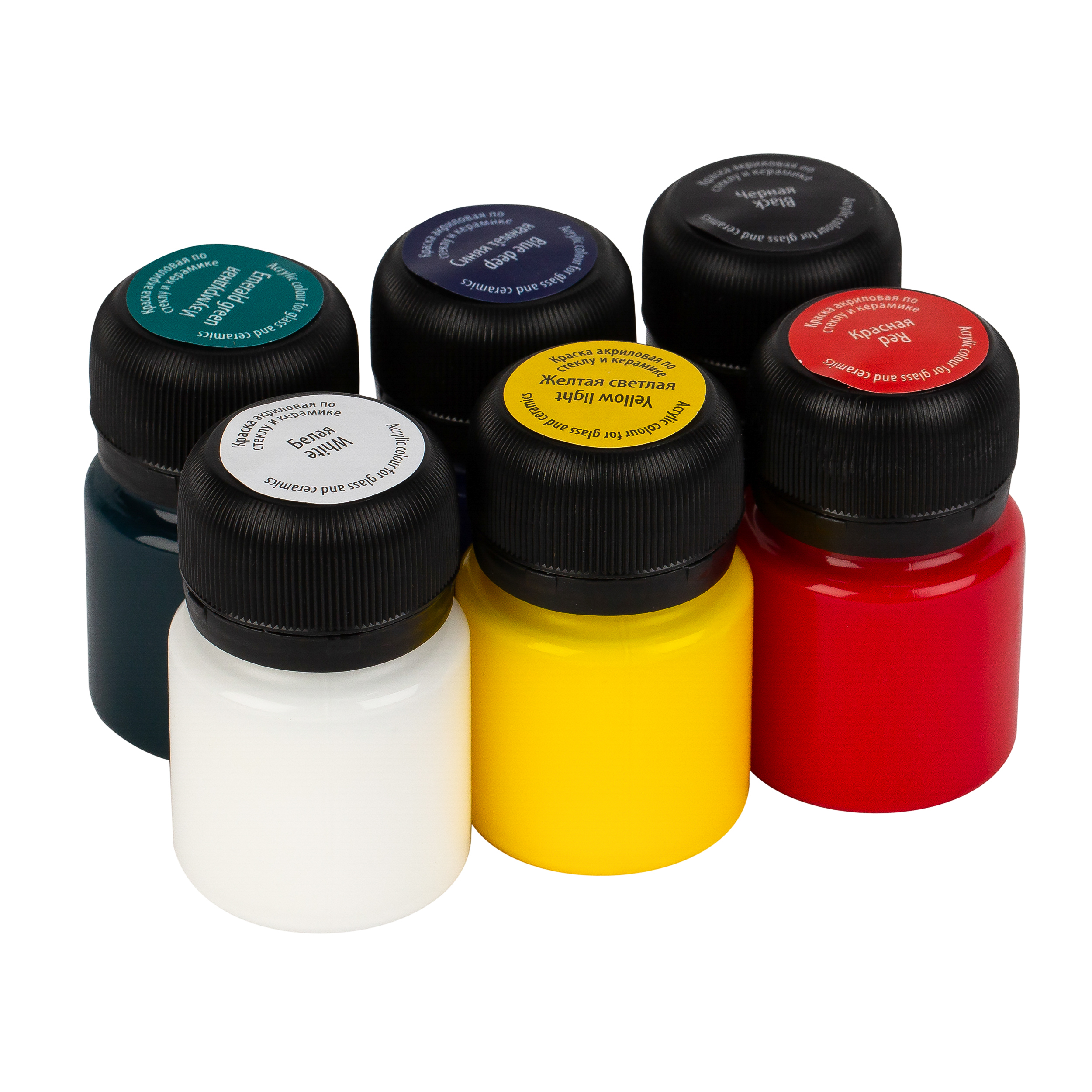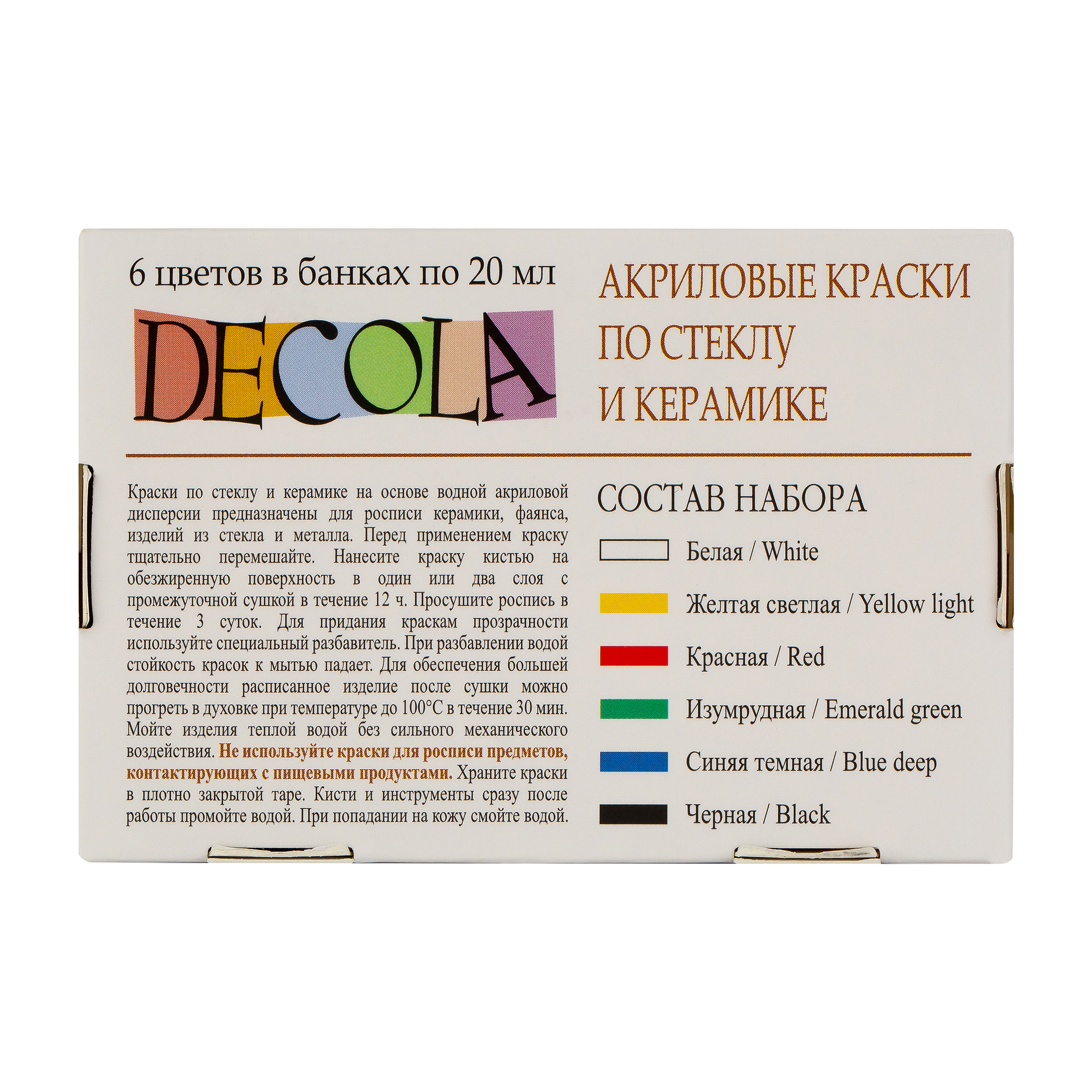 Набор красок по стеклу и керамике Decola предназначен для росписи изделий из стекла, фарфора, керамики, фаянса. Краски хорошо смешиваются между собой, сохраняют чистоту цвета в смесях, светостойки, устойчивы к воде, не требуют фиксации обжигом. Для увеличения прозрачности красок при сохранении вязкости и устойчивости готовых изделий к воздействию воды используется специальный разбавитель для акриловых красок по стеклу и керамике. В набор входит 6 цветов: белый, желтый, красный, синий, зеленый, черный. Объем: 20 мл.