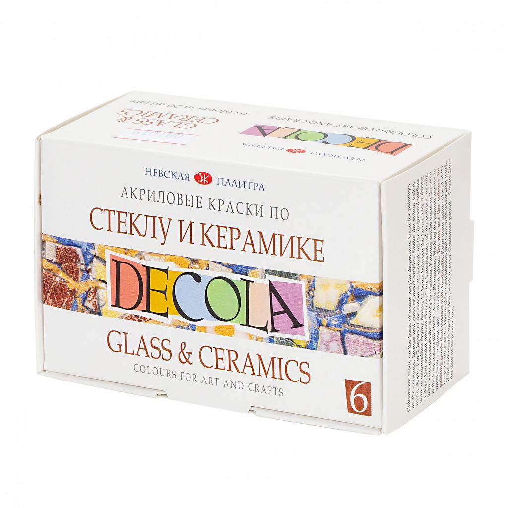 Набор красок по стеклу и керамике Decola предназначен для росписи изделий из стекла, фарфора, керамики, фаянса. Краски хорошо смешиваются между собой, сохраняют чистоту цвета в смесях, светостойки, устойчивы к воде, не требуют фиксации обжигом. Для увеличения прозрачности красок при сохранении вязкости и устойчивости готовых изделий к воздействию воды используется специальный разбавитель для акриловых красок по стеклу и керамике. В набор входит 6 цветов: белый, желтый, красный, синий, зеленый, черный. Объем: 20 мл.