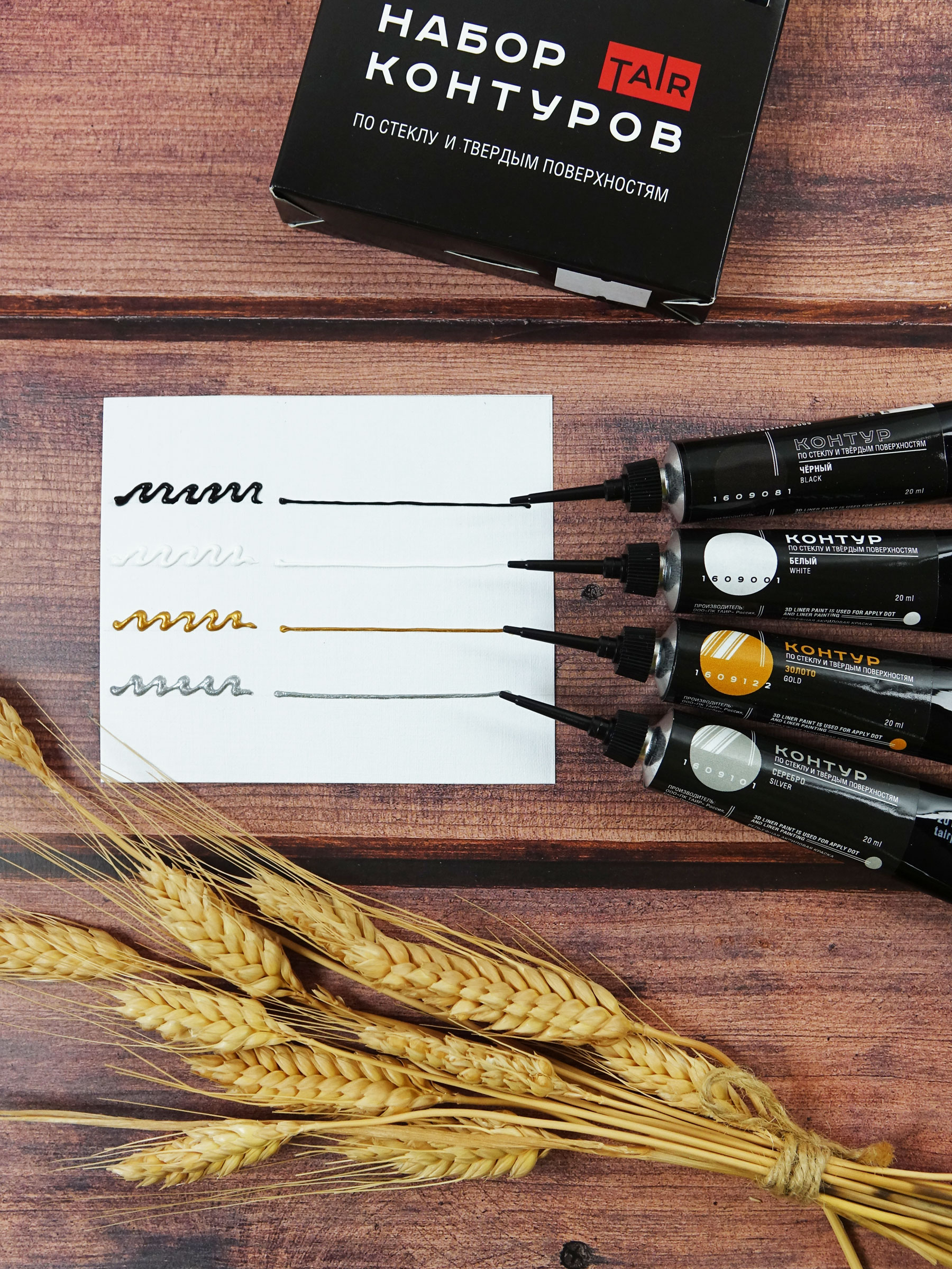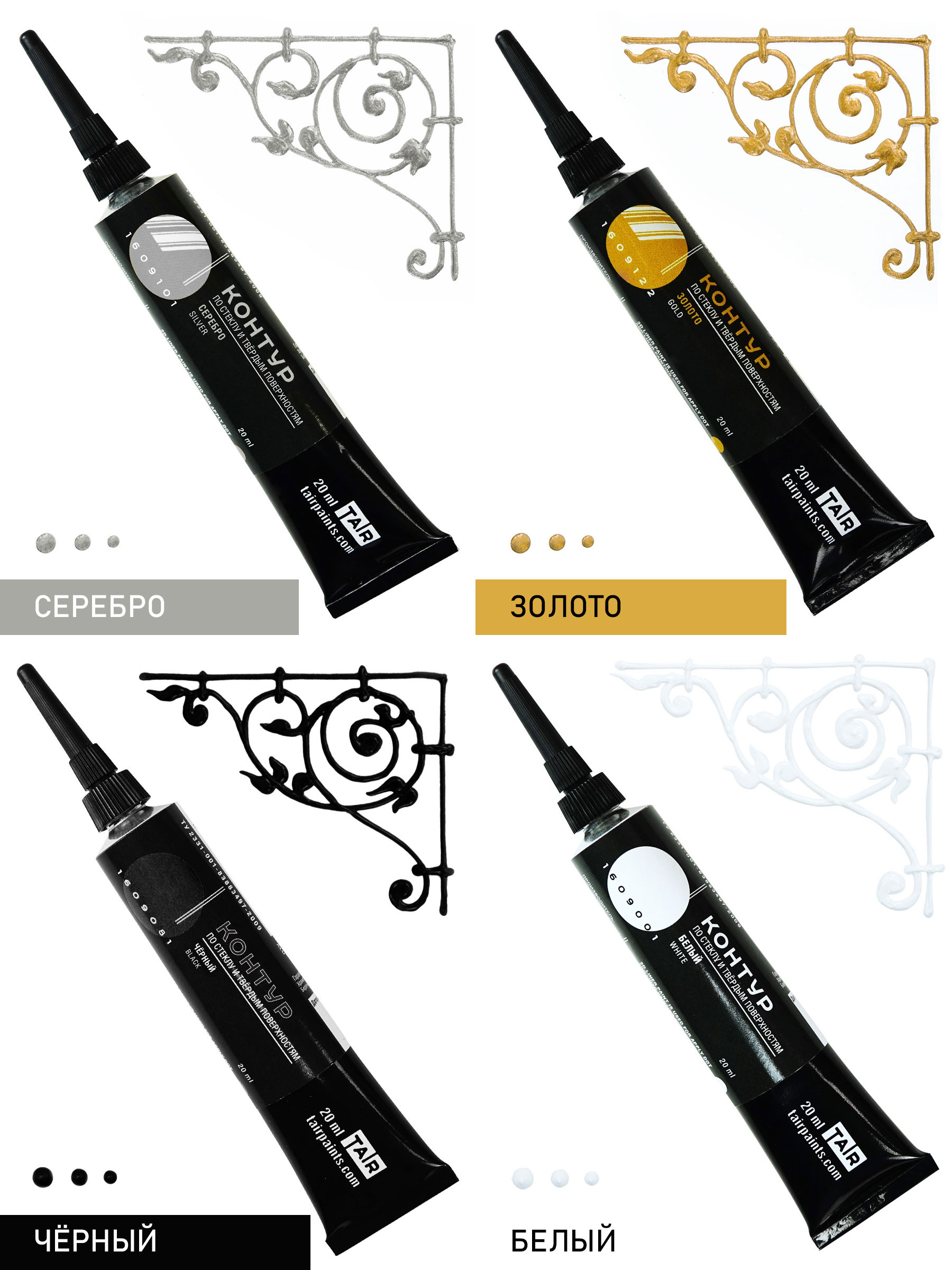 В набор входят акриловые контуры по стеклу и другим твёрдым поверхностям, 20 мл: Чёрный, Белый, Золото, Серебро. Контуры — это акриловые краски в тубе с острым наконечником, которые наносятся прямо из тюбика. Предназначены для точечной росписи, подрисовки, витражной техники и других видов хобби и творчества. Обладают высокой рельефностью и хорошо держат форму. Набор содержит подобранную профессиональными художниками гамму гармоничных оттенков. Все цвета, входящие в набор, превосходно сочетаются друг с другом и вместе создают определенное настроение. Контуры «ТАИР» отлично зарекомендовали себя в технике популярной точечной росписи и имитации вышивки. Кроме того, они используются для подрисовок тонких линий, узоров и рисования надписей в миксмедийных и скрапбукинговых техниках. В декупаже контуры часто применяются для того, чтобы скрыть границу приклеенного рисунка или для подрисовки отдельных элементов.
