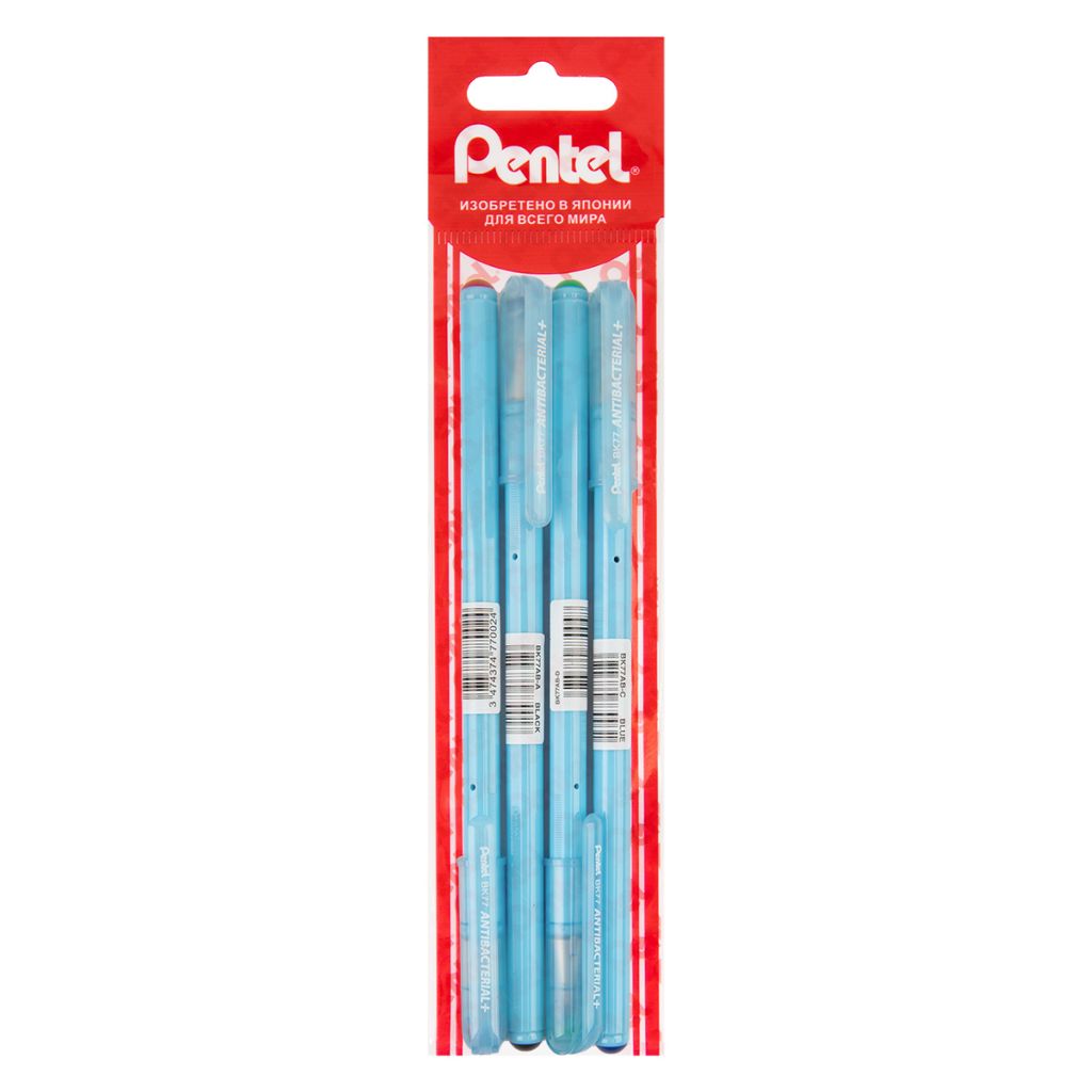 Шариковая ручка Pentel Antibacterial+ с антибактериальными свойствами. Ее корпус и колпачок содержат биоцид (активное вещество) - ионы серебра, который предотвращает размножение бактерий на поверхности ручки. Через несколько часов после использования на корпусе ручки снижается количество бактерий, а через 24 часа они полностью уничтожаются. В наборе 4 ручки разных цветов: синий, черный, красный, зеленый.