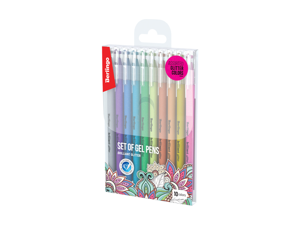 Набор гелевых ручек Berlingo Brilliant Metallic из 10 цветов с блёстками (золото, серебро, жёлтый, зелёный, кирпичный, оранжевый, розовый, голубой, синий, фиолетовый) понравится, кто ценит всё эффектное и необычное. Ручки изготовлены с использованием корейских чернил, которые обеспечивают высокое качество письма и срок годности 2 года. Бархатистое покрытие Soft touch создаёт дополнительный комфорт при использовании. Цвет корпуса каждой ручки соответствует цвету. чернил. Диаметр пишущего узла составляет 1 мм и обеспечивает мягкость письма и насыщенность цвета. Толщина линии письма 0,8 мм., длина письма 450 м.