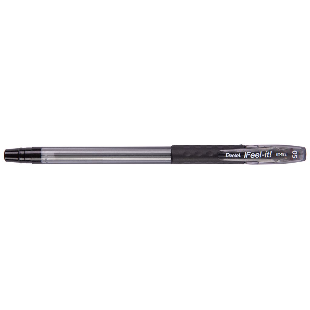 Шариковая ручка Pentel Feel it! BX485 0,5 мм. с масляными чернилами. Масляные чернила нового поколения, пишут мягко, ярко, без нажима. Эргономичный корпус с треугольной зоной захвата и резиновым покрытием. Обеспечивает правильное и удобное положение пальцевво время письма; Предотвращает скольжение пальцев; Обеспечивает максимально комфортное письмо для детской руки, предотвращает напряжение и усталость; Помогает формировать навык правильно держать пишущий инструмент, правильный почерк. Облегченныйвысококачественный прозрачный пластик корпуса, предпочтительная длина ручки0: Исключает неблагоприятное воздействие рычага, который возникает при письме более длинными и тяжёлыми пишущими инструментами; минимизирует усилия, которые приходится прикладывать ребёнку при письме. В соответствии с требованиями безопасности к детской продукции ручка оснащена вентилируемым колпачком-заглушкой. Сменный стержень длиной 144 мм Толщина линии 0,23 мм Диаметр шарика 0,5 мм Корпус пластик Длина письма 950 м Сменный стержень с шариком из карбида вольфрама. Масляные чернила.