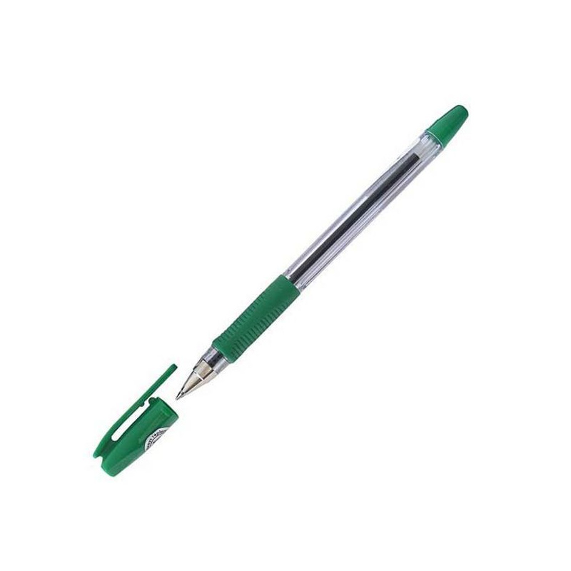 Прозрачный пластиковый корпус с резиновым антискользящим грипом для удобства письма. Металлический наконечник. Чернила на масляной основе пишут легко и мягко на бумаге любого типа. Цвет колпачка и резиновой накладки соответствует цвету чернил. Диаметр шарика - 0,7 мм., толщина линии - 0,32 мм. Цвет чернил - зеленый.