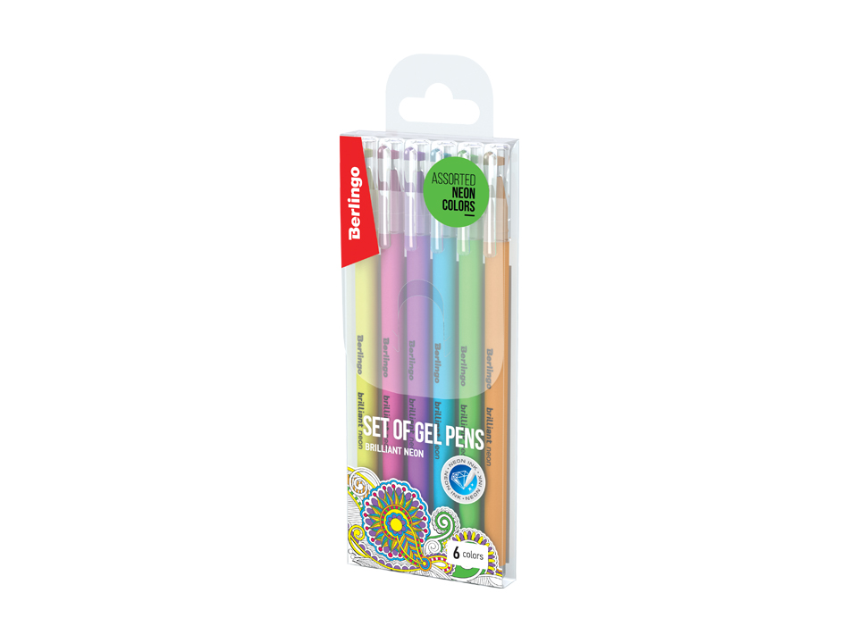 Набор гелевых ручек Berlingo "Brilliant Neon" из 6 неоновых цветов с флуоресцентным эффектом: жёлтый, зелёный, оранжевый, розовый, голубой, фиолетовый. Утончённый корпус с бархатистым покрытием soft-touch, прозрачный колпачок с клипом. Цвет корпуса соответствует цвету чернил. Корейские водо- и светостойкие чернила. Оптимальный диаметр пишущего узла – 0,8 мм – для мягкости письма и насыщенности цвета.