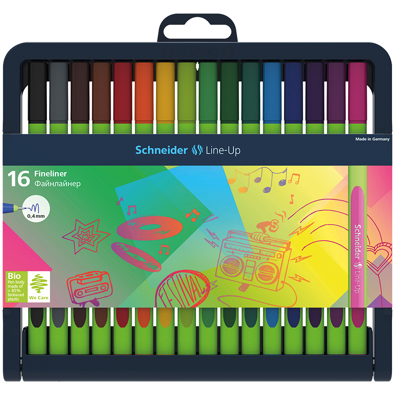 Набор капиллярных ручек Schneider Line-Up в ярком дизайне. Капиллярные ручки предназначены для письма, рисования, раскрашивания и черчения. Диаметр пишущего узла ручки составляет 0,4 мм, толщина линии письма – 0,4 мм. Они могут находиться без колпачка до 3-х дней и не высыхают. Эргономичный трехгранный прорезиненный салатовый корпус с элементами, соответствующими цвету чернил, изготовлен из инновационного пластика на биооснове. В наборе 16 цветов: синий, чёрный, красный, зелёный, голубой, фиолетовый, розовый, оранжевый, жёлтый, зелёное яблоко, светло-зелёный,морская волна, сиреневый, коричневый,светло-коричневый, серый. Упакованы в удобный пластиковый футляр-подставку с европодвесом. Письменные принадлежности Schneider разрабатываются и производятся только в Германии, их отличают функциональный дизайн, безупречное качество, надежность и экологичность.