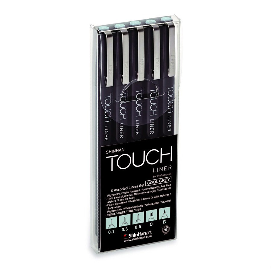 TOUCH LINER - наиболее совершенные линеры для профессионалов, на основе пигментных чернил архивного качества, идеально подходящих для скетчинга, иллюстраций, точного рисования, графического дизайна и работы с документами. Чернила в линерах ShinHan TOUCH не размазываются, водостойкие, беcкислотные, архивного качества, светостойкие, не содержат ксилен и соответствуют международному стандарту ASTM D4236. Линеры TOUCH доступны в девяти размерах пишущего пера: от 0.05 мм до 0.8 мм, а также с кистевым и плоским пером. Разновидности толщины и формы пера линеров TOUCH позволяют удовлетворить самые требовательные запросы художников и дизайнеров. Перо-кисть и скошенное перо также дают возможность работы над сложными задачами, которые ранее были не доступны. В данном наборе представлены 5 линеров серого холодного цвета с диаметром пишущего узла от 0,1, 0,3, 0,5 мм, скошенным наконечником и наконечником кистью. Линеры TOUCH сертифицированы ACMI (Arts & Creative Materials Institute, США)