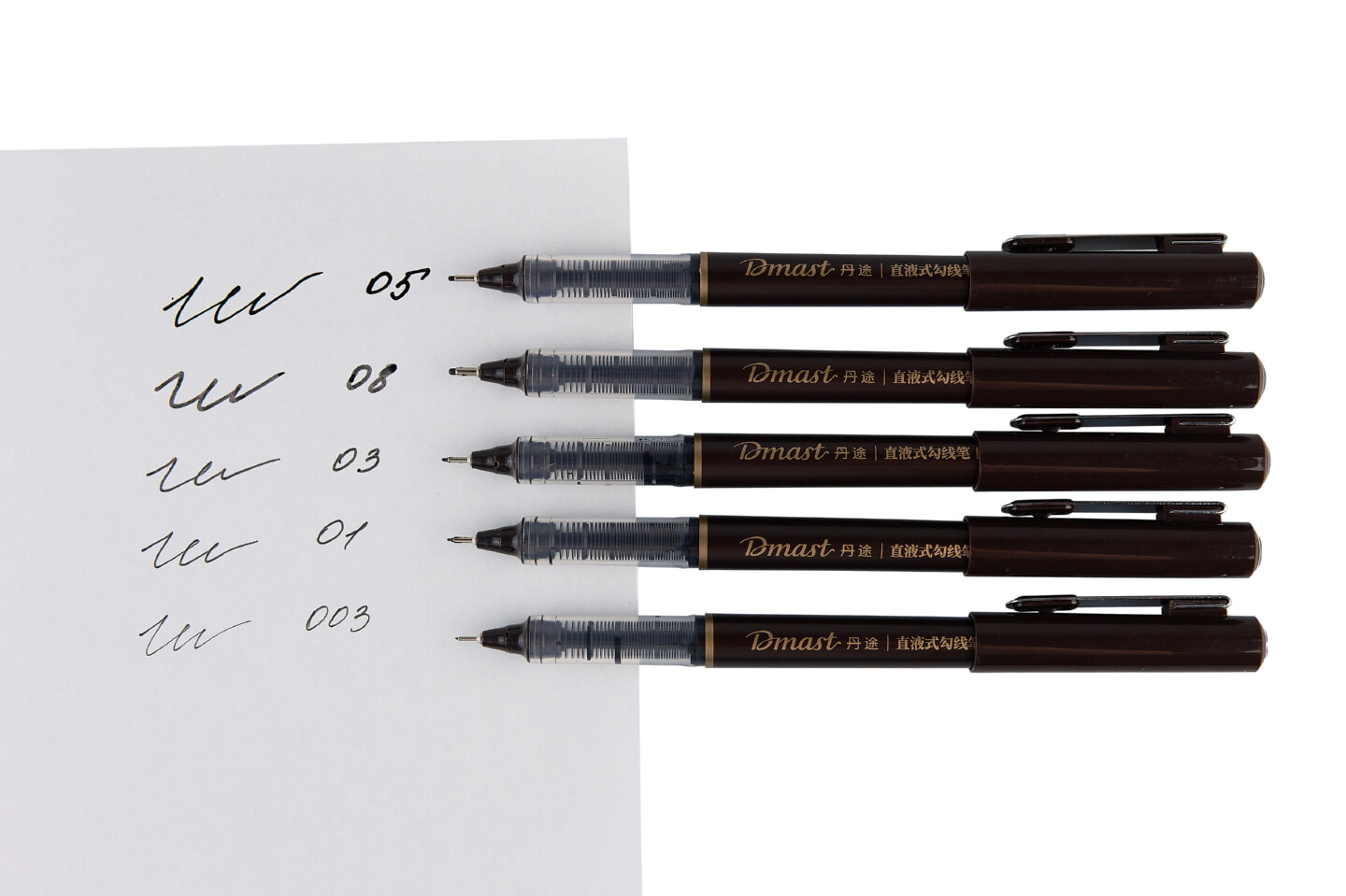 Капиллярные ручки-линеры Dmast содержат водостойкие пигментные чернила черного цвета. Чернила быстро сохнут и не размываются водой или чернилами. Линеры Dmast предназначены для рисования и технического рисунка. Длина линии письма составляет от 200 до 500 метров и зависит от плотности и фактуры бумаги.
