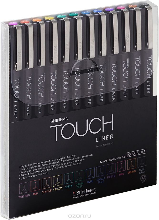 О серии: TOUCH LINER - наиболее совершенные линеры для профессионалов, на основе пигментных чернил архивного качества, идеально подходящих для скетчинга, иллюстраций, точного рисования, графического дизайна и работы с документами. Черные чернила в линерах ShinHan TOUCH не размазываются, водостойкие, беcкислотные, архивного качества, светостойкие, не содержат ксилен и соответствуют международному стандарту ASTM D4236. Цветные линеры TOUCH доступны с пером-кистью и тонким пером 0.1 мм для точной работы. Разновидности толщины и формы пера линеров TOUCH позволяют удовлетворить самые требовательные запросы художников и дизайнеров. Перо-кисть и скошенное перо также дают возможность работы над сложными задачами, которые ранее были не доступны. В данном наборе 12 линеров разных цветов, толщина пишущего узла 0,1 мм. Применение: для графических и оформительских работ, иллюстрации и леттеринга. Производство: компания из Южной Кореи «ShinHan Art International Inc» славится своей продукцией, предназначенной для иллюстраторов, аниматоров, дизайнеров и архитекторов. Компания была основана в 1967 году и на тот момент называлась «Haneel». Сегодня «ShinHan Art International Inc» славится во всем мире превосходным качеством своей продукции. Особенностью данной марки является внимание к деталям и дизайну. Применение современных технологий и следование традициям производства, позволяют создавать эргономичные, удобные и сверхнадежные канцелярские принадлежности. Продукция компании используются в различных сферах и популярна среди профессиональных художников, а также любителей творчества и хобби.
