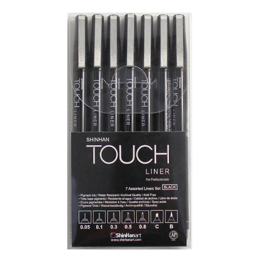 TOUCH LINER - наиболее совершенные линеры для профессионалов, на основе пигментных чернил архивного качества, идеально подходящих для скетчинга, иллюстраций, точного рисования, графического дизайна и работы с документами. Черные чернила в линерах ShinHan TOUCH не размазываются, водостойкие, беcкислотные, архивного качества, светостойкие, не содержат ксилен и соответствуют международному стандарту ASTM D4236. Черные линеры TOUCH доступны в девяти размерах пишущего пера: от 0.05 мм до 0.8 мм, а также с кистевым и плоским пером. Разновидности толщины и формы пера линеров TOUCH позволяют удовлетворить самые требовательные запросы художников и дизайнеров. Перо-кисть и скошенное перо также дают возможность работы над сложными задачами, которые ранее были не доступны. В данном наборе представлены 7 линеров с диаметром пишущего узла от 0,05 до 0,8 мм. Линеры TOUCH сертифицированы ACMI (Arts & Creative Materials Institute, США)