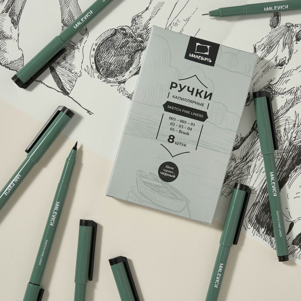 Наборы капиллярных ручек Малевичъ - новая линейка бюджетных линеров. Уменьшенный диаметр корпуса, более легкий пластик, с минималистичным дизайном, в тредновом цвете "мох" В ручках используются специальные водостойкие архивные чернила на пигментной основе с высокой степенью светостойкости и глубоким черным цветом. Рисунок после высыхания не размывается водой и спиртом, линеры можно использовать в смешанной технике с акварелью, акрилом или маркерами. Чернила идентичны линейке Graf'Art в фирменном цвете, ложатся ровно, без пропусков и клякс, быстро сохнут и не размазываются.