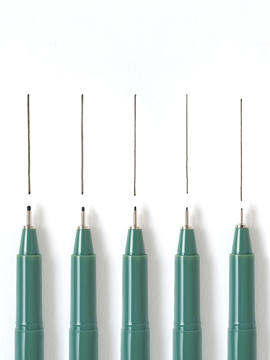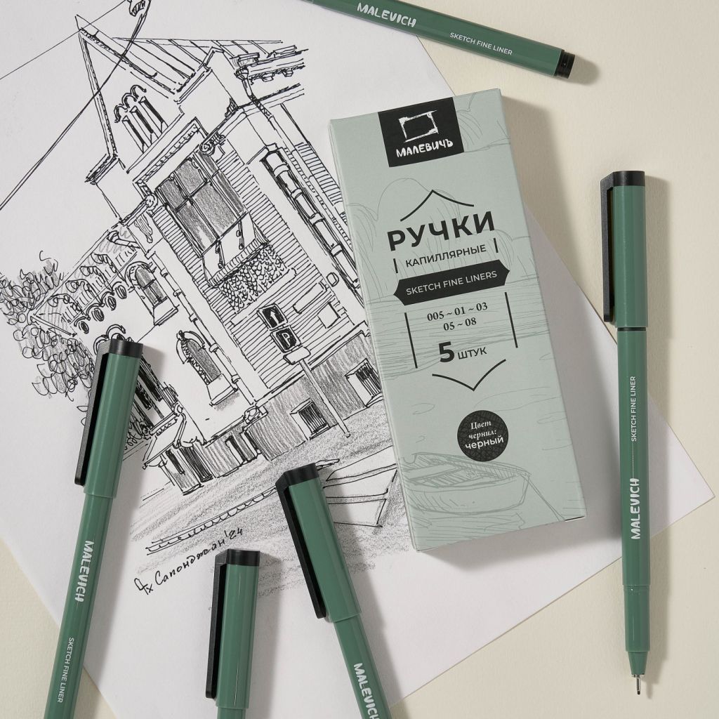 Наборы капиллярных ручек Малевичъ - новая линейка бюджетных линеров. Уменьшенный диаметр корпуса, более легкий пластик, с минималистичным дизайном, в тредновом цвете "мох" В ручках используются специальные водостойкие архивные чернила на пигментной основе с высокой степенью светостойкости и глубоким черным цветом. Рисунок после высыхания не размывается водой и спиртом, линеры можно использовать в смешанной технике с акварелью, акрилом или маркерами. Чернила идентичны линейке Graf'Art в фирменном цвете, ложатся ровно, без пропусков и клякс, быстро сохнут и не размазываются.